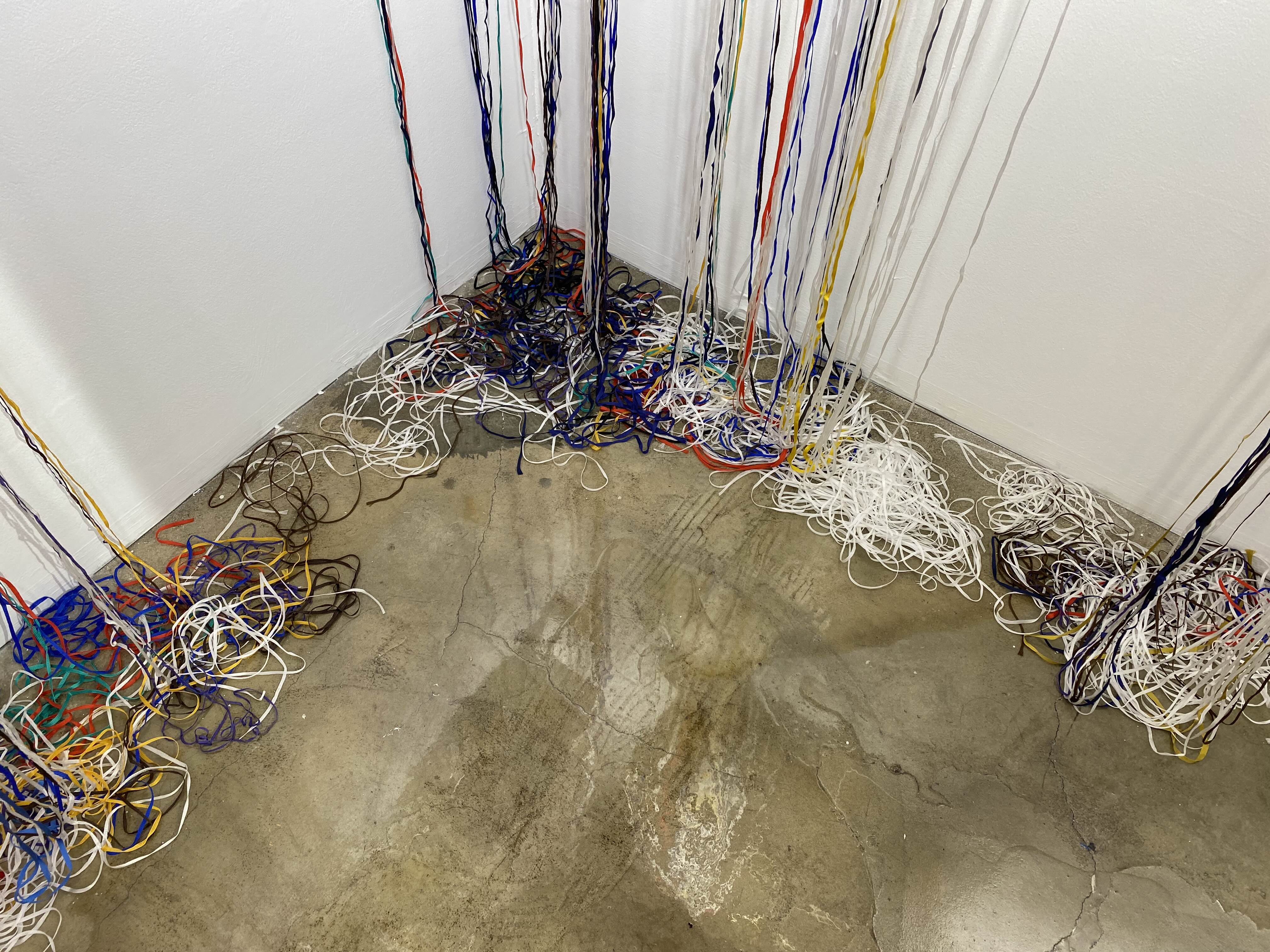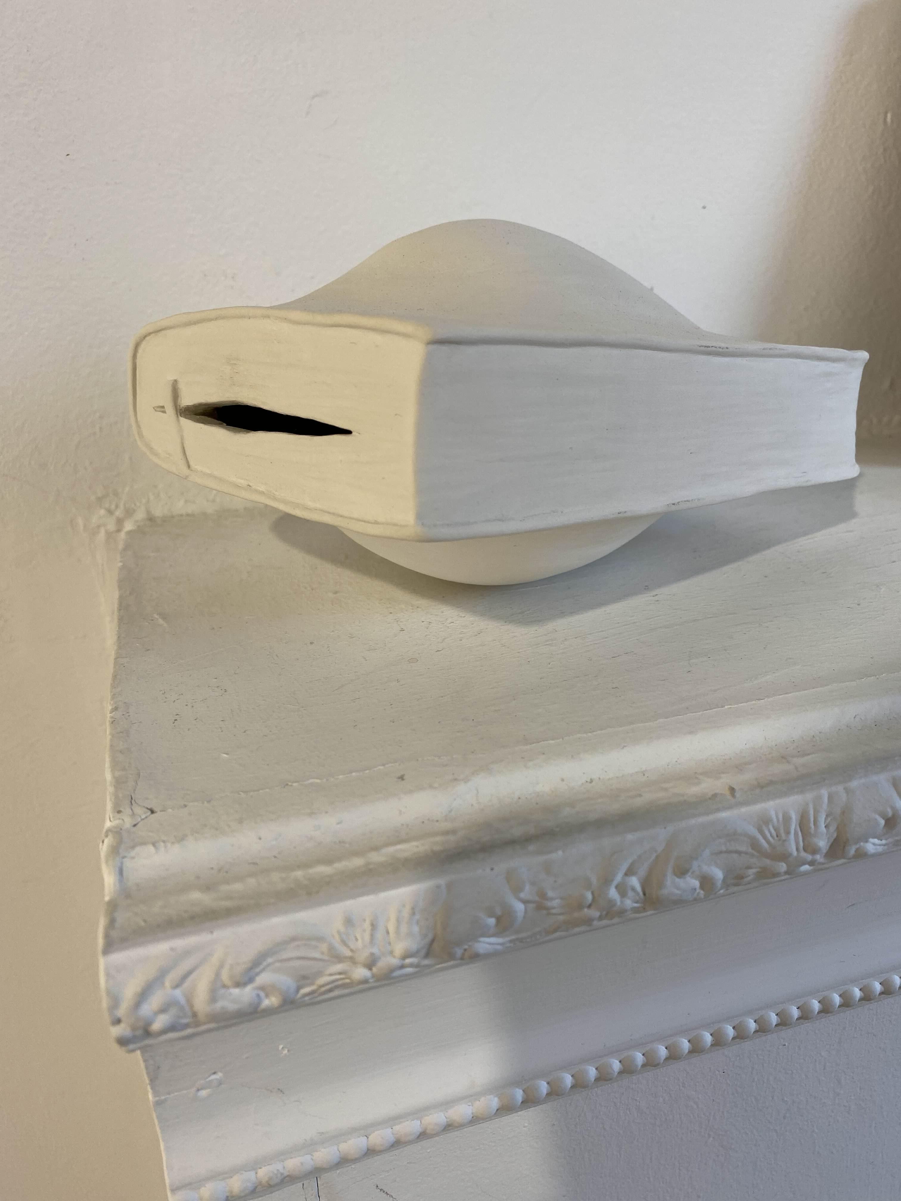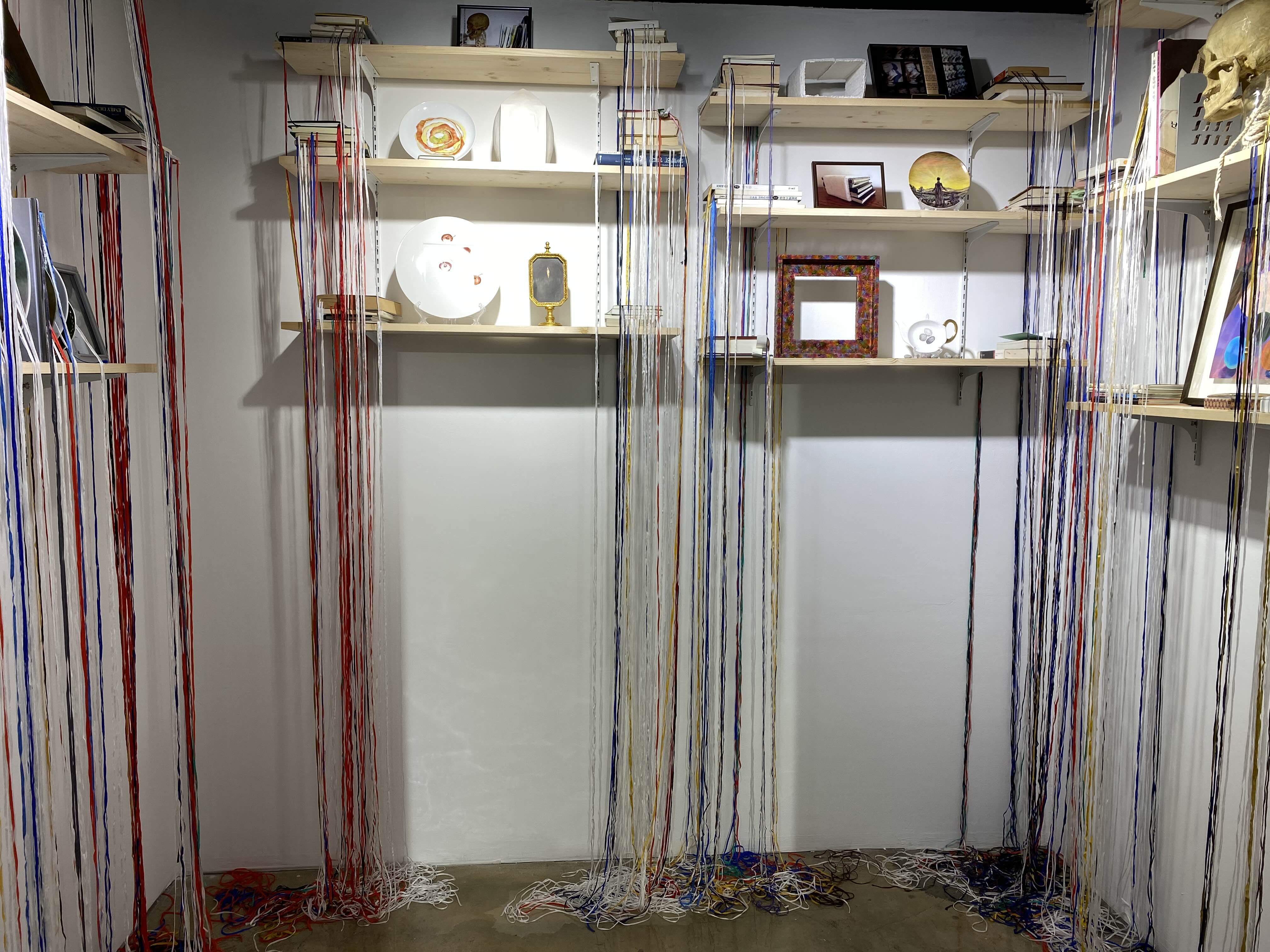 다음 방을 가득 채우는 것은 책들 그리고 읽는 이의 편의를 위해 일정 페이지 이상의 양장본에 쓰이는 가름끈이 길게 연장되어 만들어내는 폭포이다. 책은 완결되고 고정된 결과물이다. 권이적이고 꽉 막혀 있으며 그 사이에는 비집고 들어갈 틈이란 없어 보인다. 그 사이의 접시. 접시를 만들어 그는 책 사이에 꽂았다. 달그락 거리는 접시를 진열장에 꽂아 꺼낼 때마다 조심스러운 대신 책을 좋아하는 그는 책 사이에 접시를 꽂았다. 여기서 다시 예술은 삶으로 화하고 삶은 예술에게 말을 건넨다.