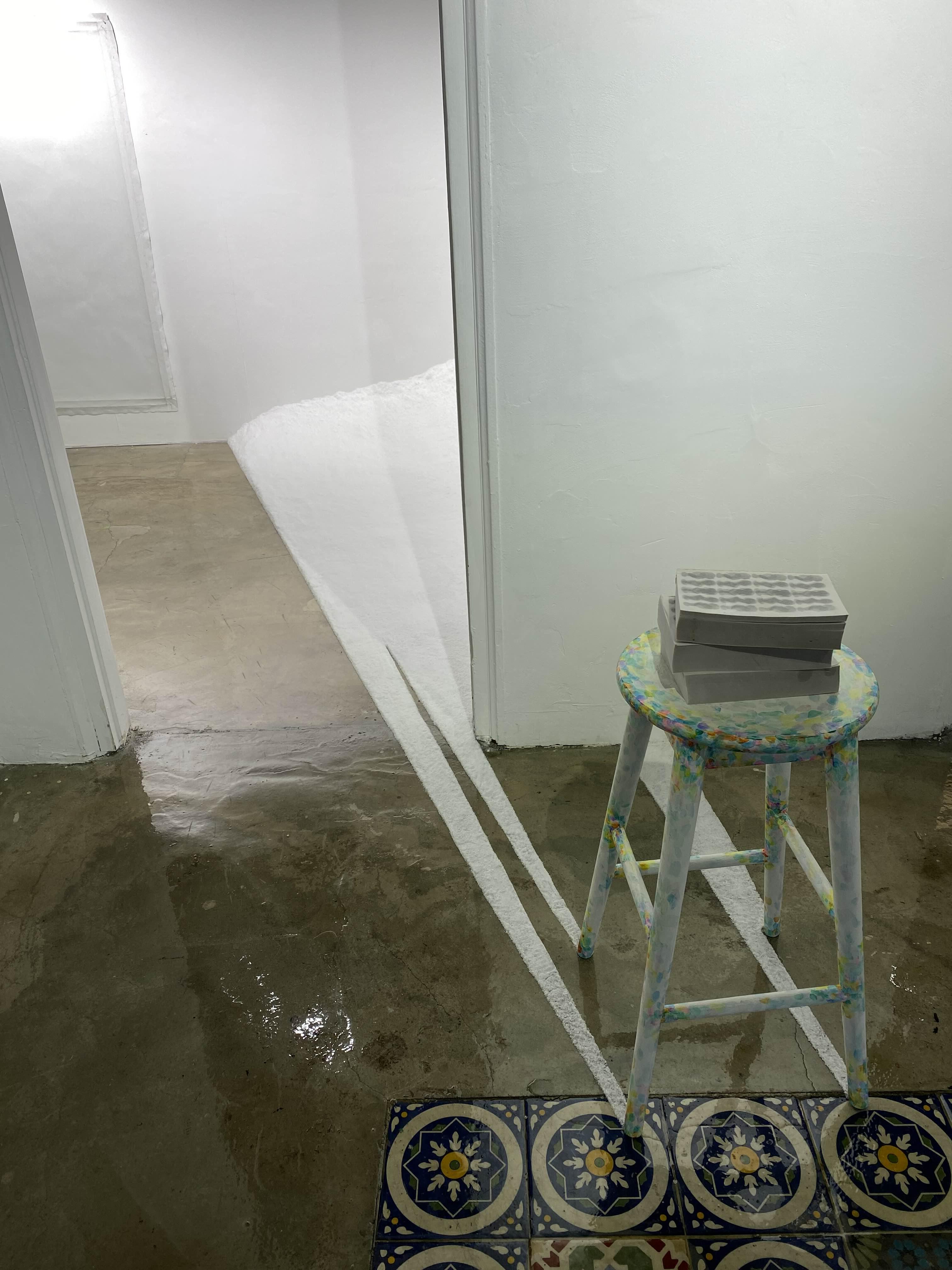 폭포를 돌아 나와 마주하는 의자에게는 하얀 그림자가 있다. 삶과 예술 사이에서 그 차이를 아무것도 아닌 것으로 만드는 그는 이제 보이지 않게 하기. 보이지 않는 것을 보이지 않는 듯 존재하게 하기에 몰입한다. 그저 의자의 그림자는 소금으로 만들어지고 정성 들여 만들었으나 굽지 않아 언제 소멸될지 모르는 제기를 마주보는 족자에는 돌아가고 말 것을 그대로 두기. 에고로 만들어진 존재로만 여겨지는 예술가의 작업이라기에 그 존재를 무에 가깝게 만드는 작업. 그의 작업은 이제 눈에 띄지 않을 만큼 낮아지고 이 없음에 가까운 상태는 하나의 기도로 향한다.