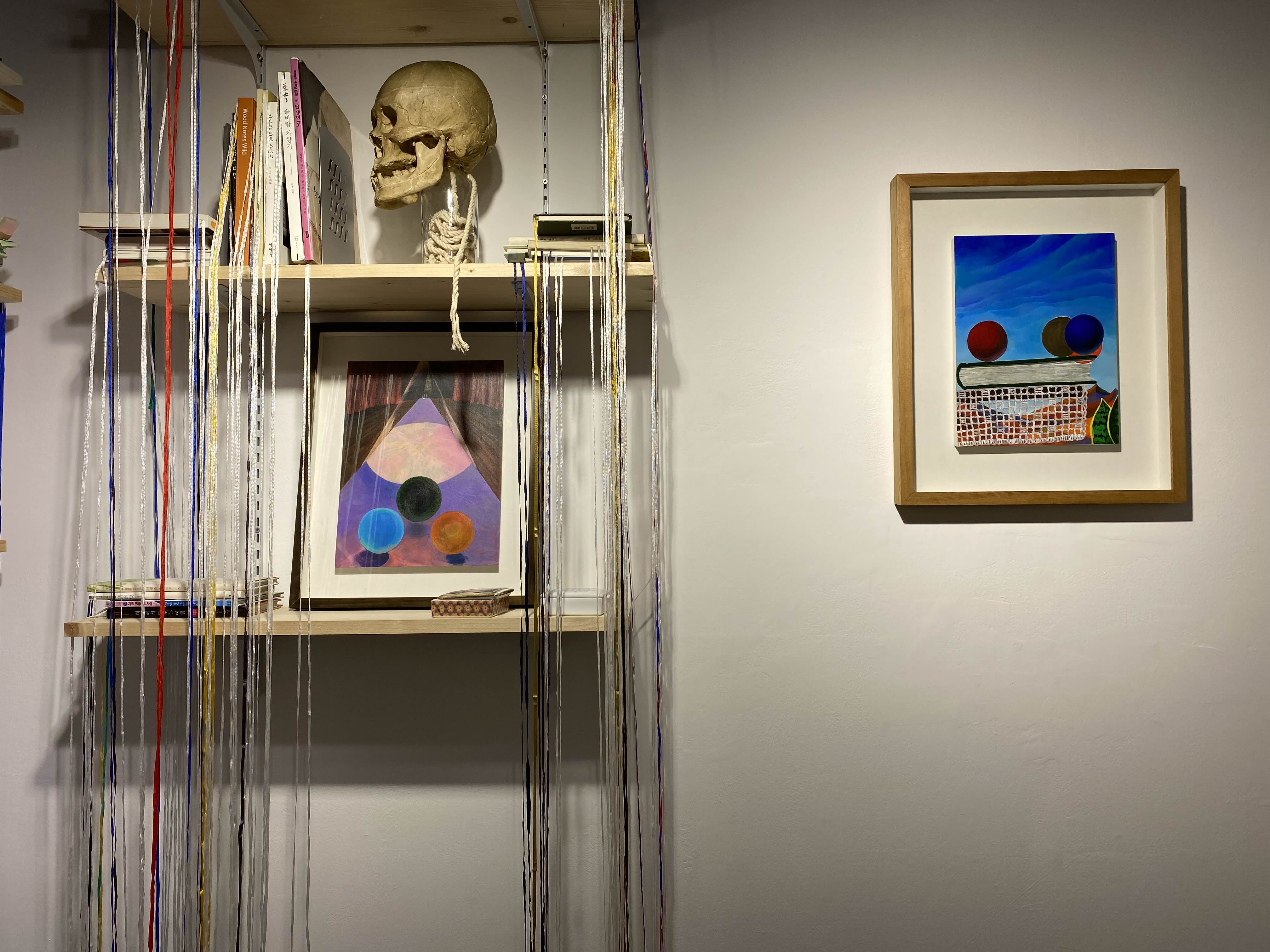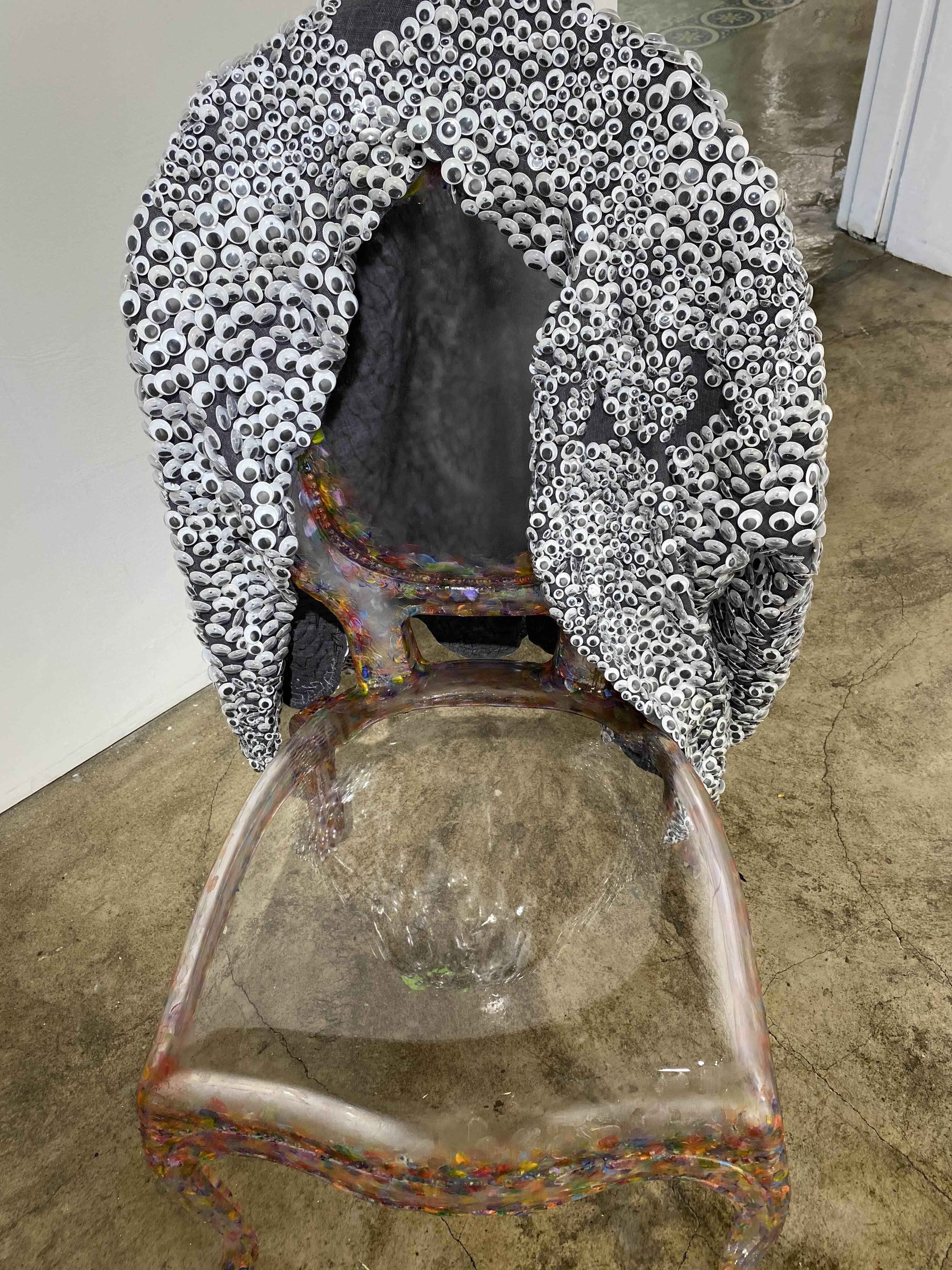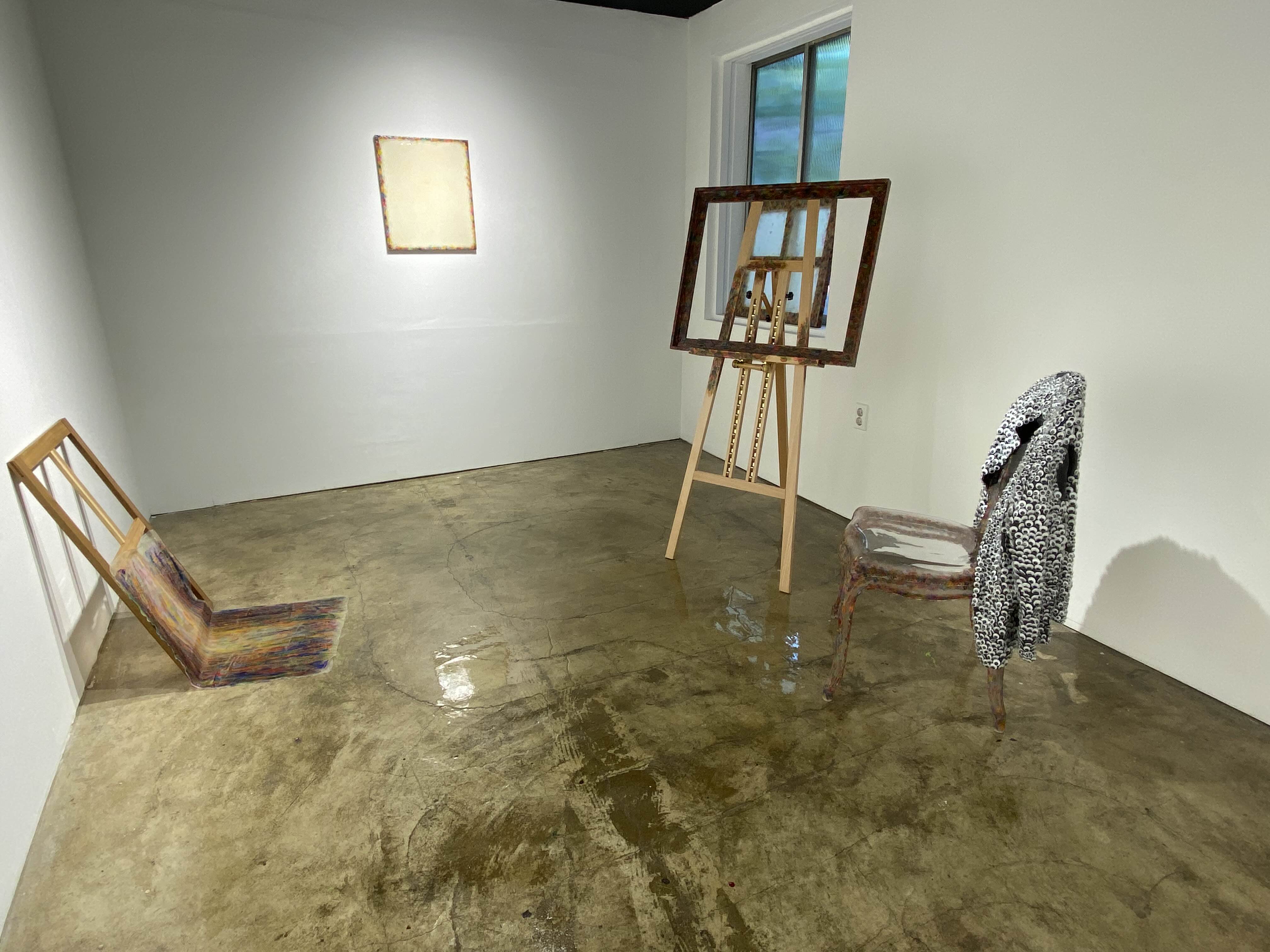 물감이 덕지덕지 발린 액자의 틀. 캔버스까지도 벗겨내고 안료만 남아 다시 나무틀을 감싼 회화는 그의 예술가로서의 삶에 출발이 되었던 회화과 미술학도로서의 연구 강령을 보여준다. 그러나 반전인 것은 그러한 안료 실험과 나란히 발견하게 되는 익살스러운 인형 눈알 자켓이다. 이 작품의 킬링 포인트는 트로트 가수의 의상과도 같은 화려함 이면에 더 소란스러운 청각적 자극이다. 인형의 눈알들은 얇은 투명 공간 속에서 무척이나 소란스럽다. 삶의 비루함과 예술의 닿을 수 없는 듯한 숭고는 여기서 풍자된다. 이 자켓을 걸치고 돌아다니는 그를 전시장에서 마주한다면 그것은 큰 행운일테다.