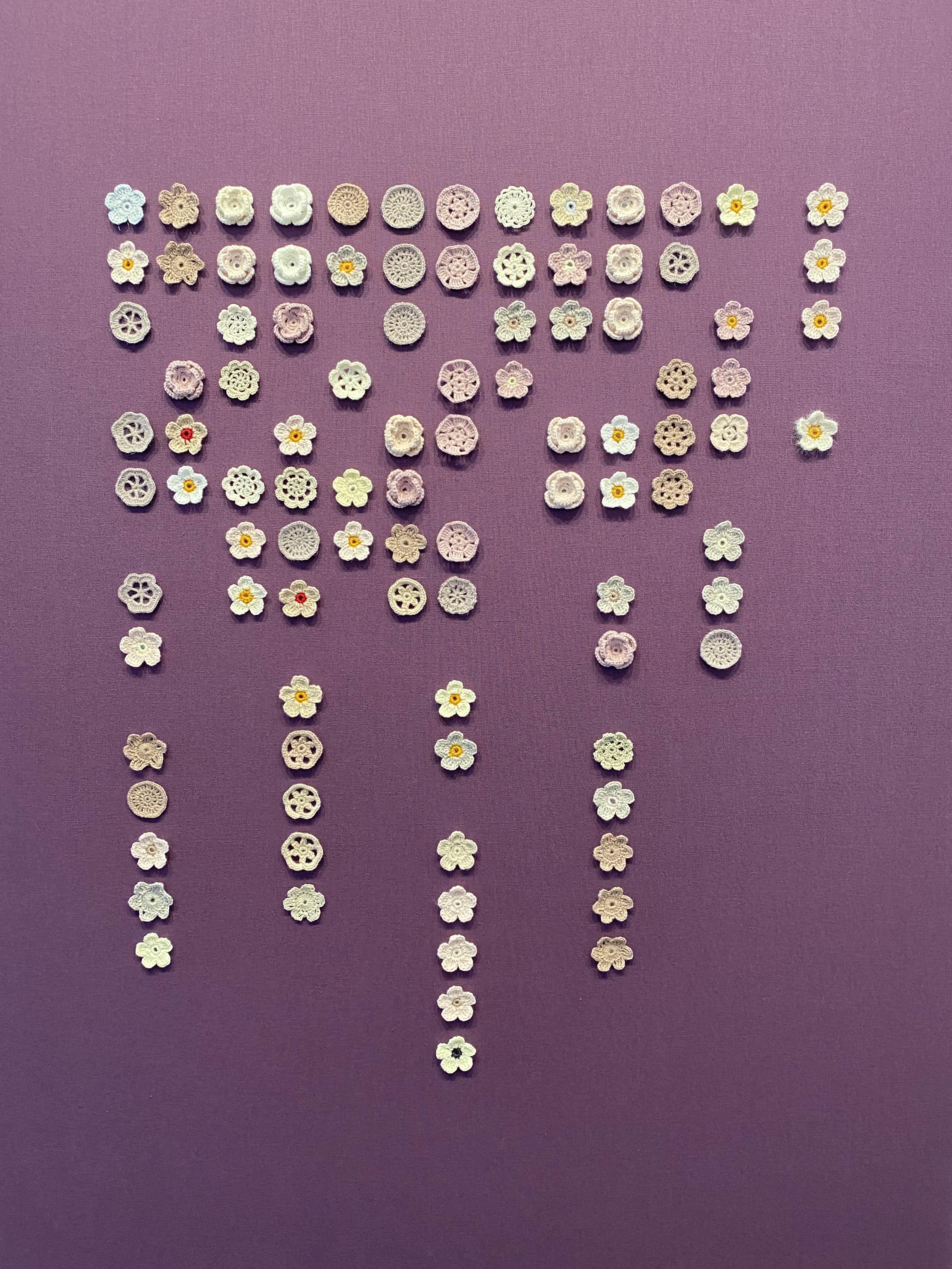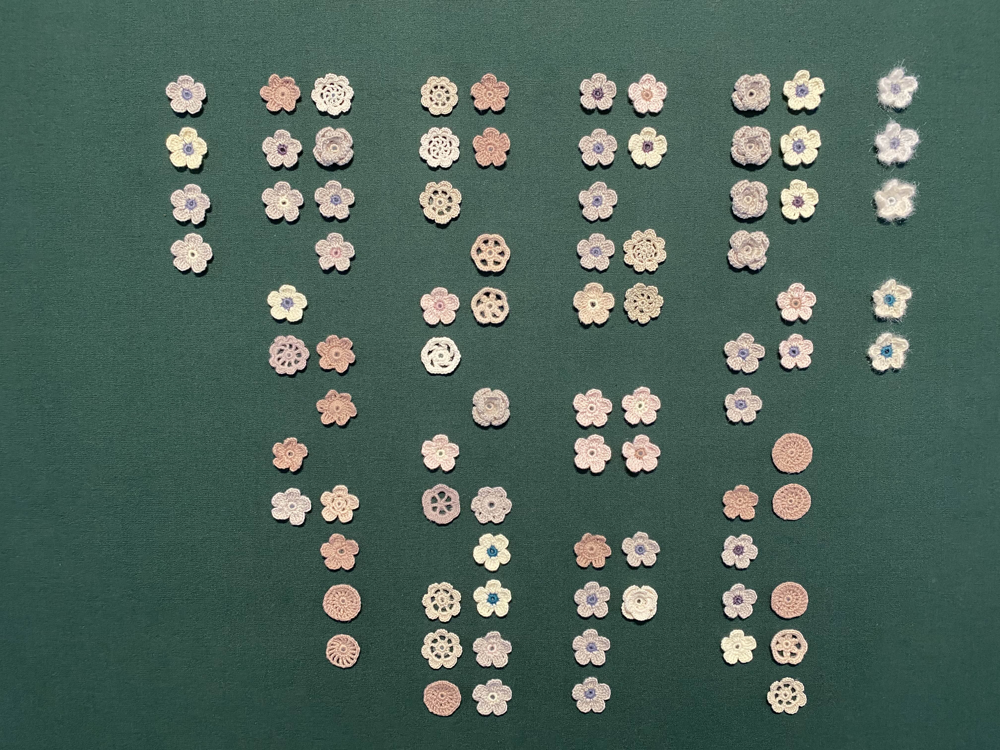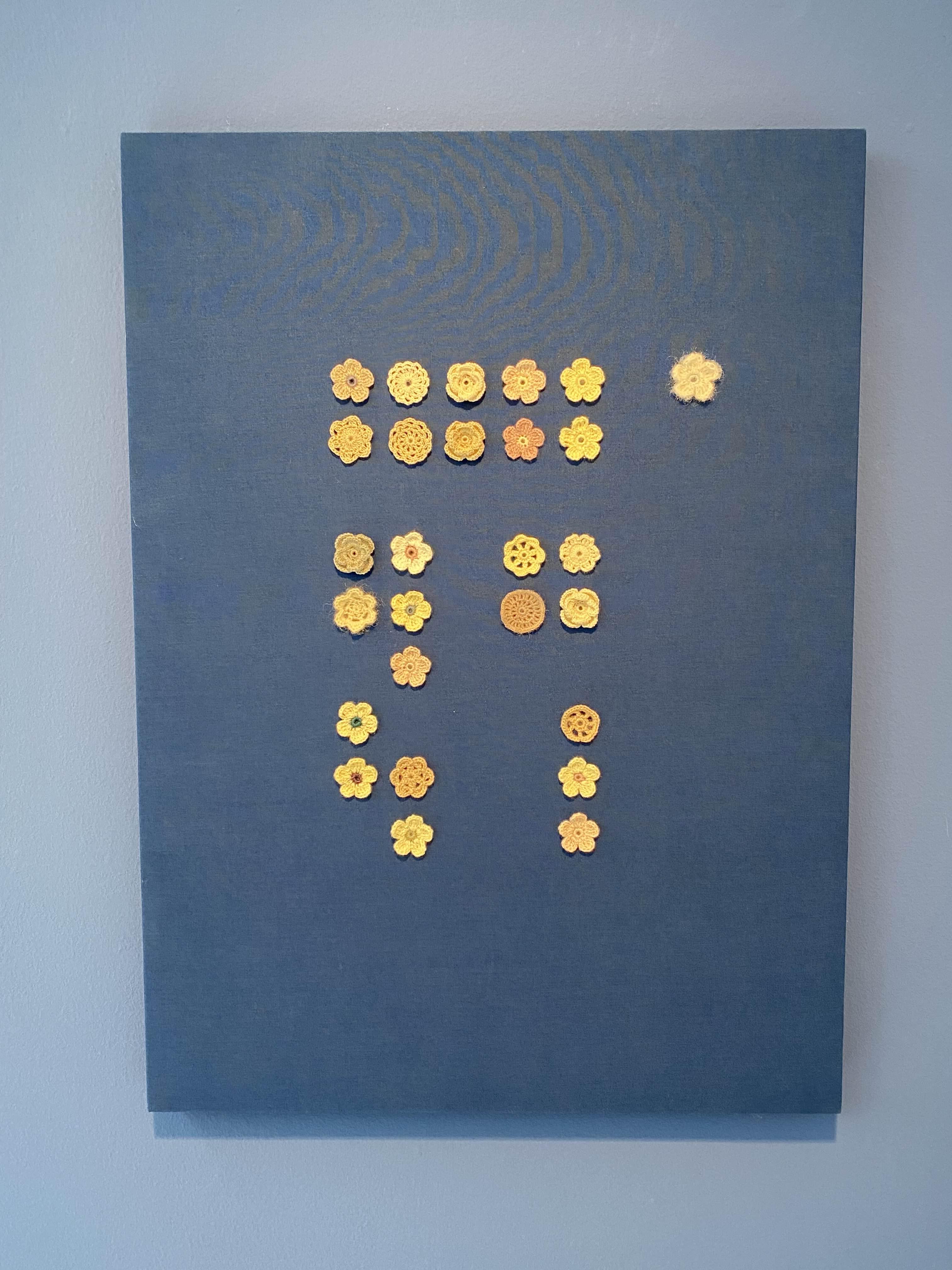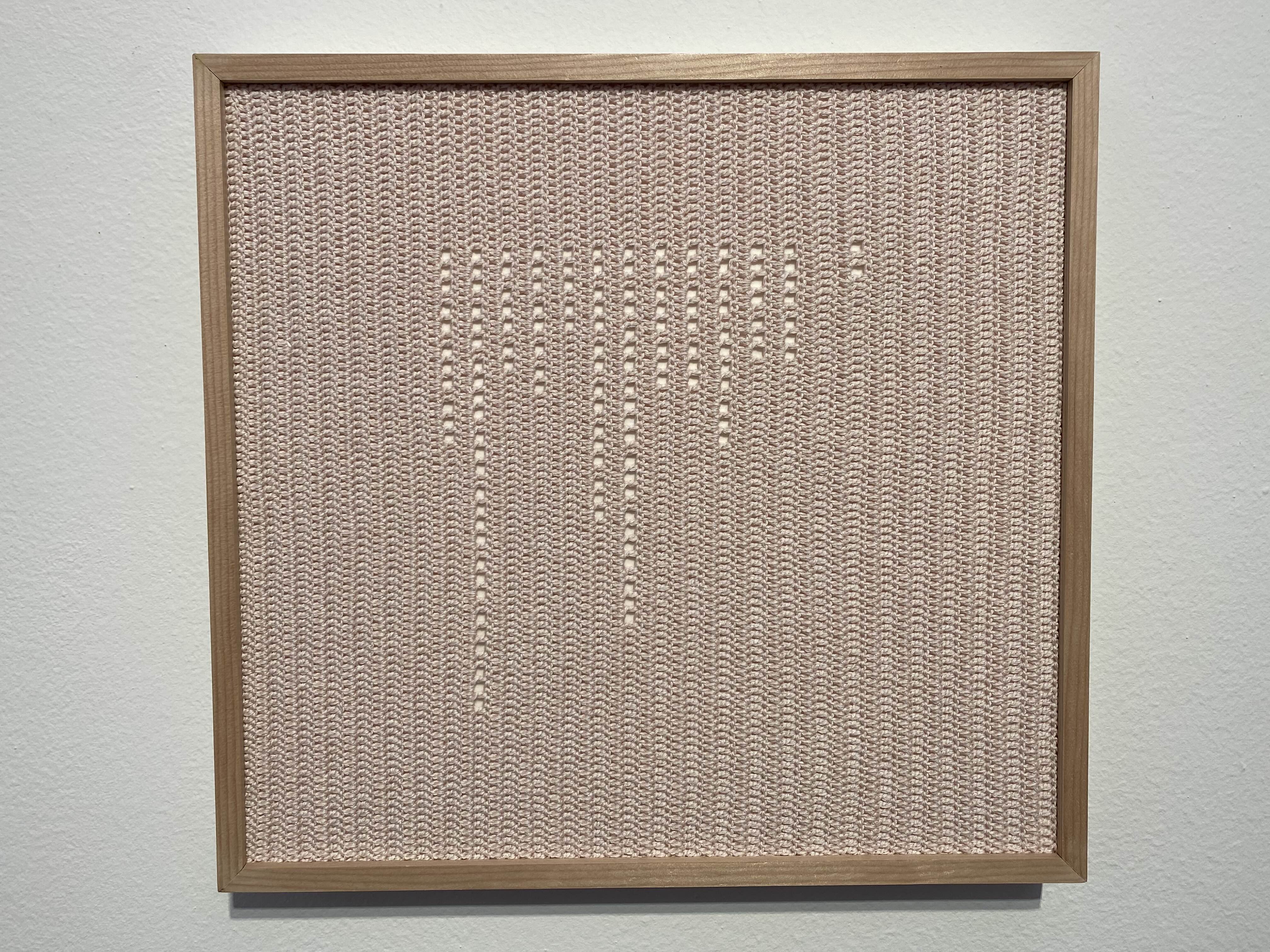 문자의 사회적 특성을 여성적이고 자연적인 방식으로 녹여내고자 한 고산금 작가가 작품의 재료로 선택한 것은 실과 비즈다. 작가는 원문의 이면에서 내비치는 감성을 섬세한 시선으로 관찰해 문자가 사라진 자리를 채울 재료와 기법을 다양하게 채택한다. 이번 전시를 위해 작가는 근·현대문학과 팝송의 텍스트를 소재로 차용했는데, 시를 소재로 한 작품은 뜨개질 방식으로 작업해 은유를 함유한 시상의 느낌을 부드럽게 형상화한다. 뜨개질은 보온을 위한 옷을 만드는 목적뿐 아니라 독특한 문양을 넣어 짜 내려갈 수 있는 특성 때문에 여인의 손을 거쳐 가문의 문양을 전수해오기도 했다. 또한 그 과정에서 실의 탄성을 조절하는 힘에 의해 만든 이의 호흡과 시간이 작품에 고스란히 담겨 기록되는 기법이다.
