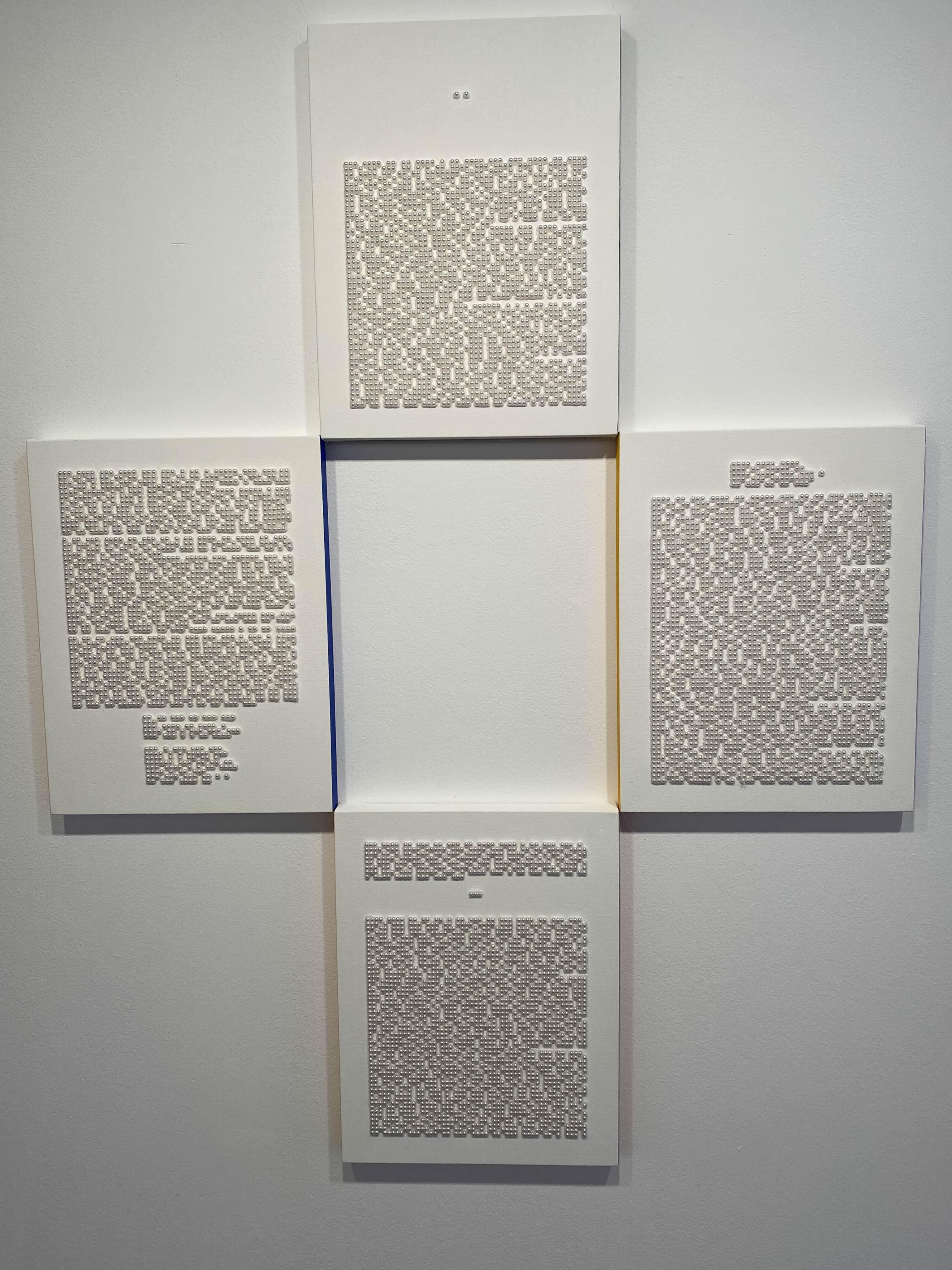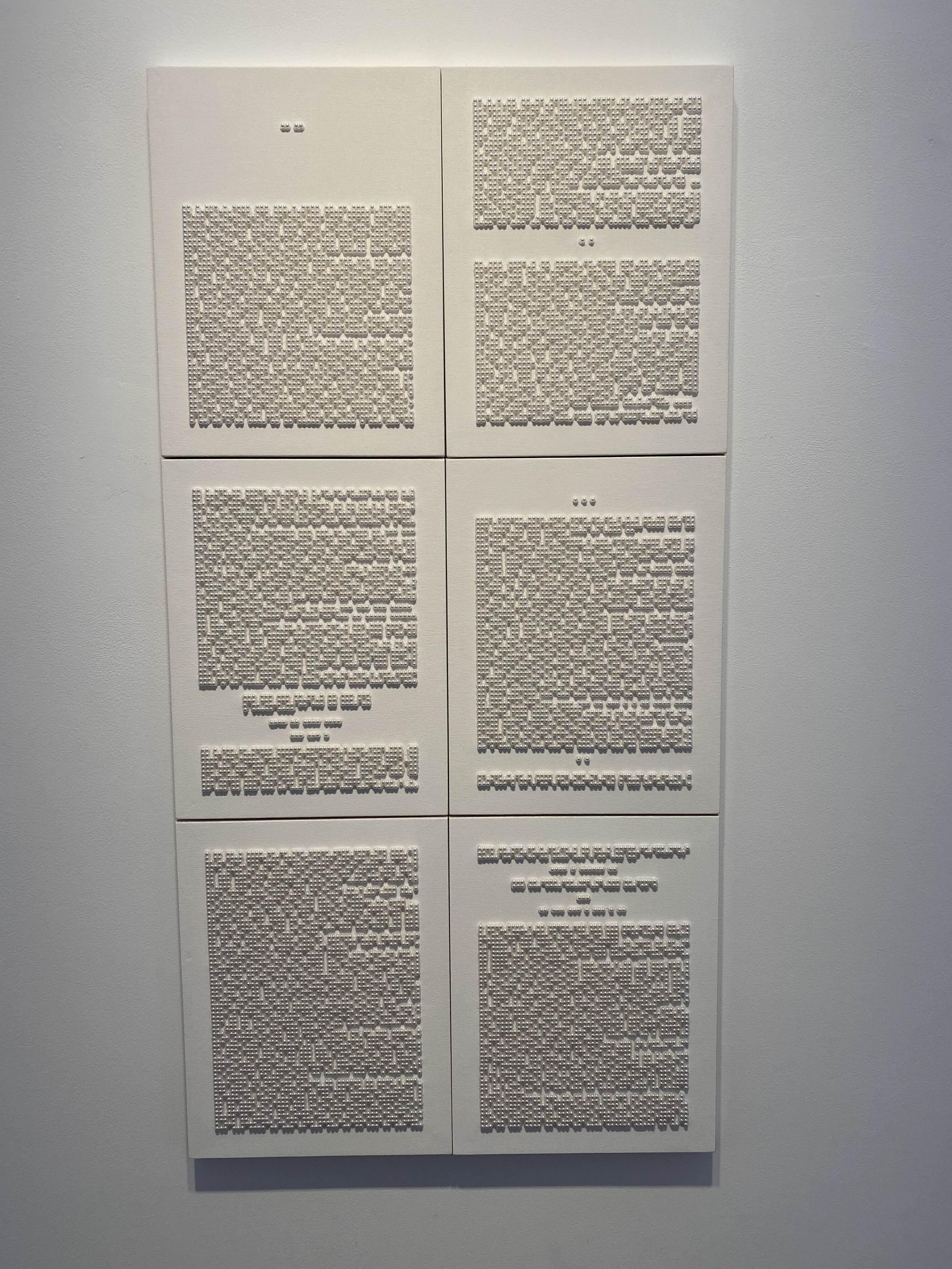 압구정로데오역에 위치한 노블레스컬렉션에서 진행중인 전시입니다. 텍스트를 실과 비즈를 이용해 이미지화한 작품을 만날 수 있습니다. 문학과 팝송을 소재로 했다고 하는데요. 작품에서 글자를 읽을 수는 없지만 이미지를 보며 어떤 내용일지 상상하며 작품을 감상하게 됩니다. 기존에 무채색을 주로 사용한 이전 작품과 달리 이번 전시에는 색을 활용한 신작을 볼 수 있습니다.