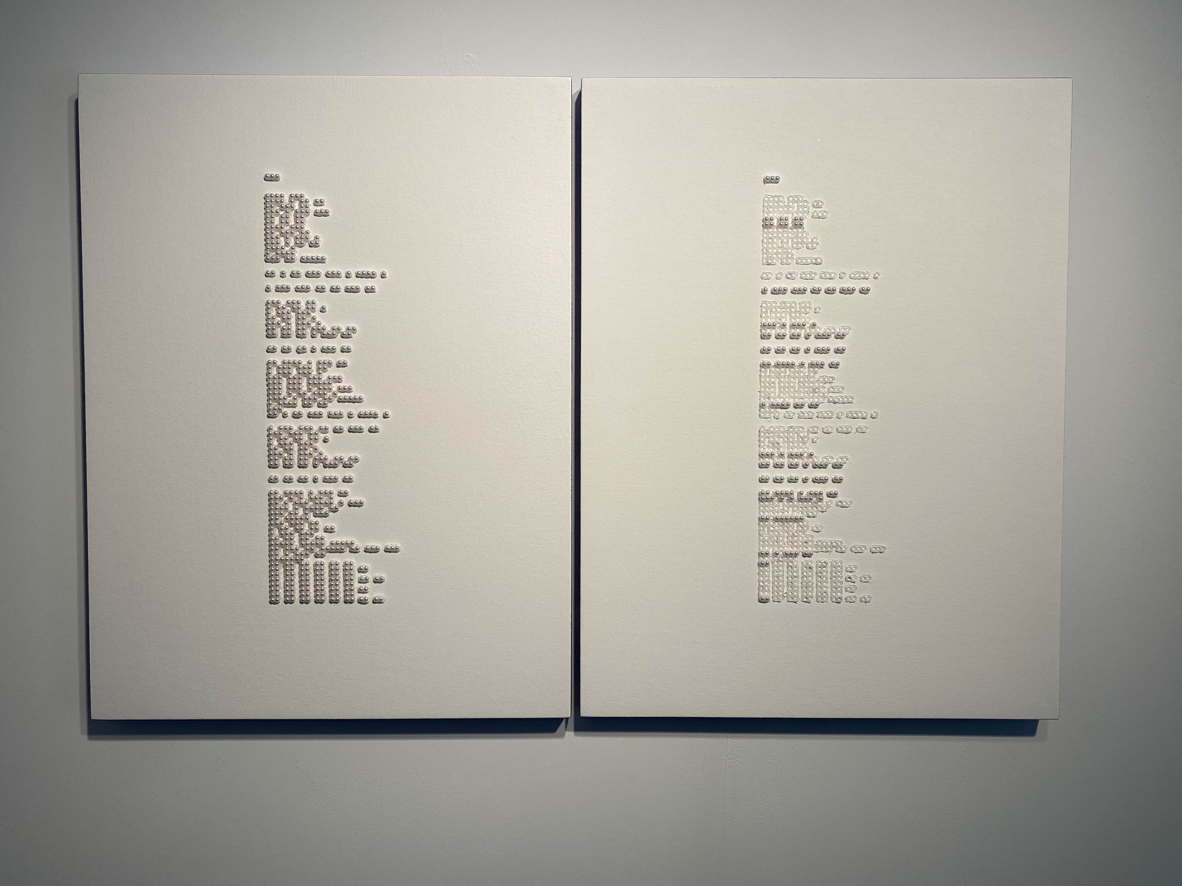 반면에 비즈를 사용한 작품은 보다 단단하고 매끈한 감성으로 텍스트를 치환해낸다. 전시 출품작 중 팝송을 모티브로 한 작품은 한쪽 면에선 비즈로 쓰인 노랫말이 반짝이고, 나란히 놓인 다른 면에는 비즈를 부착했던 흔적만 남아 있다. 작가는 마치 해변에 남은 발자국처럼 비즈로 써 내려간 글의 자리만 남긴 채 비즈를 제거하는 방식으로 쌍둥이 작품을 완성했다. 양각과 음각을 아름답게 병치한 이 작품은 아티스트가 곡을 통해 전하는 메시지와 그 곡이 팬들의 마음속 깊이 남긴 흔적을 보여주며 화면에서 상호 소통을 암시하는 것으로 해석된다.