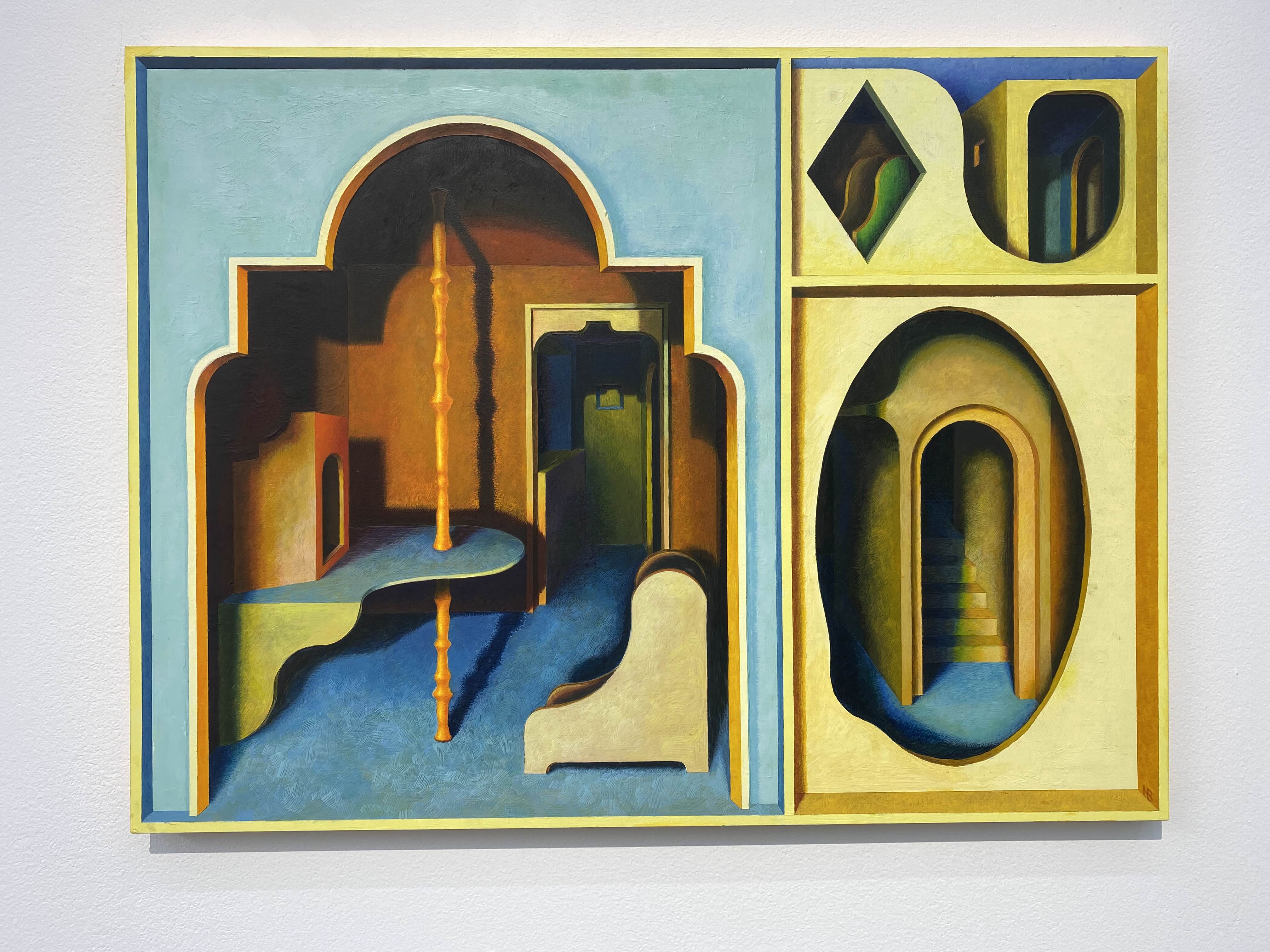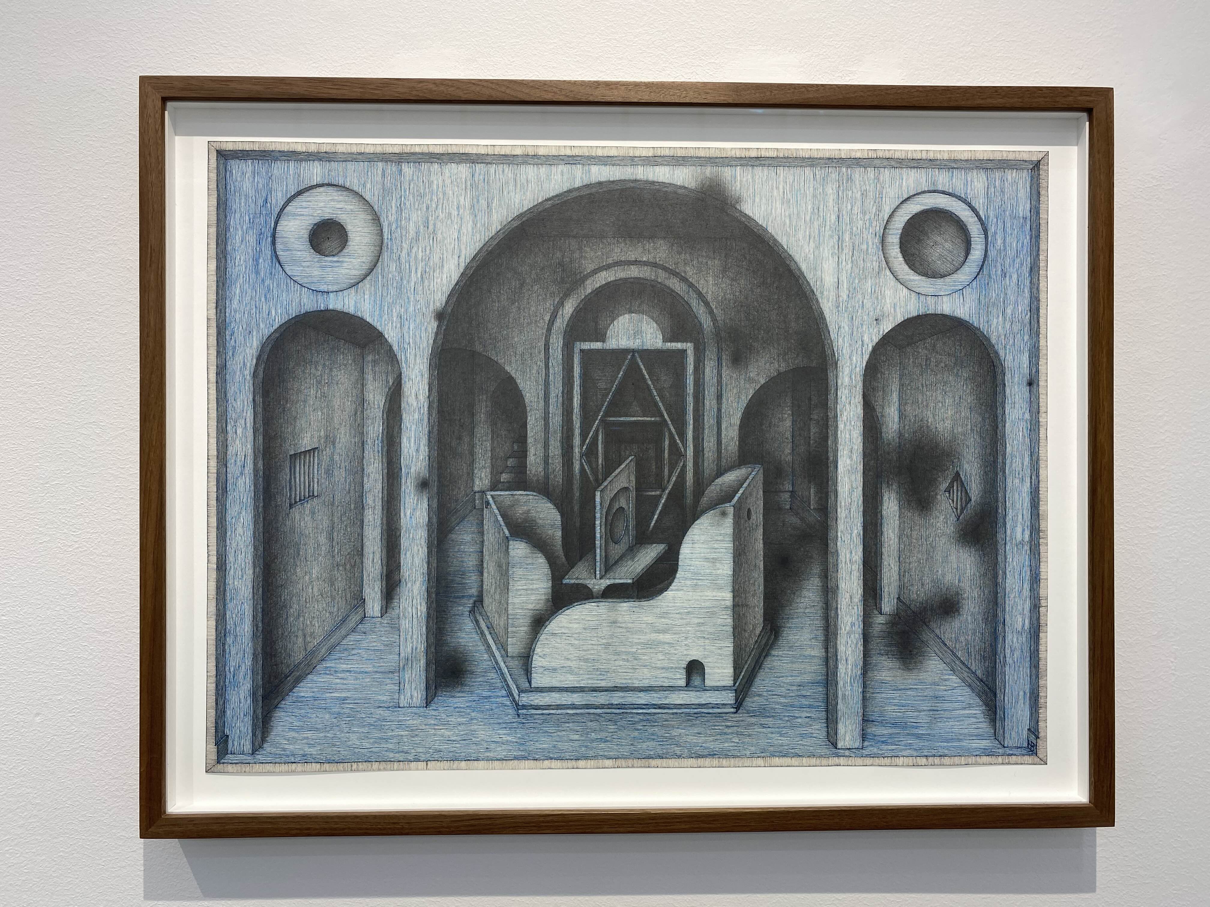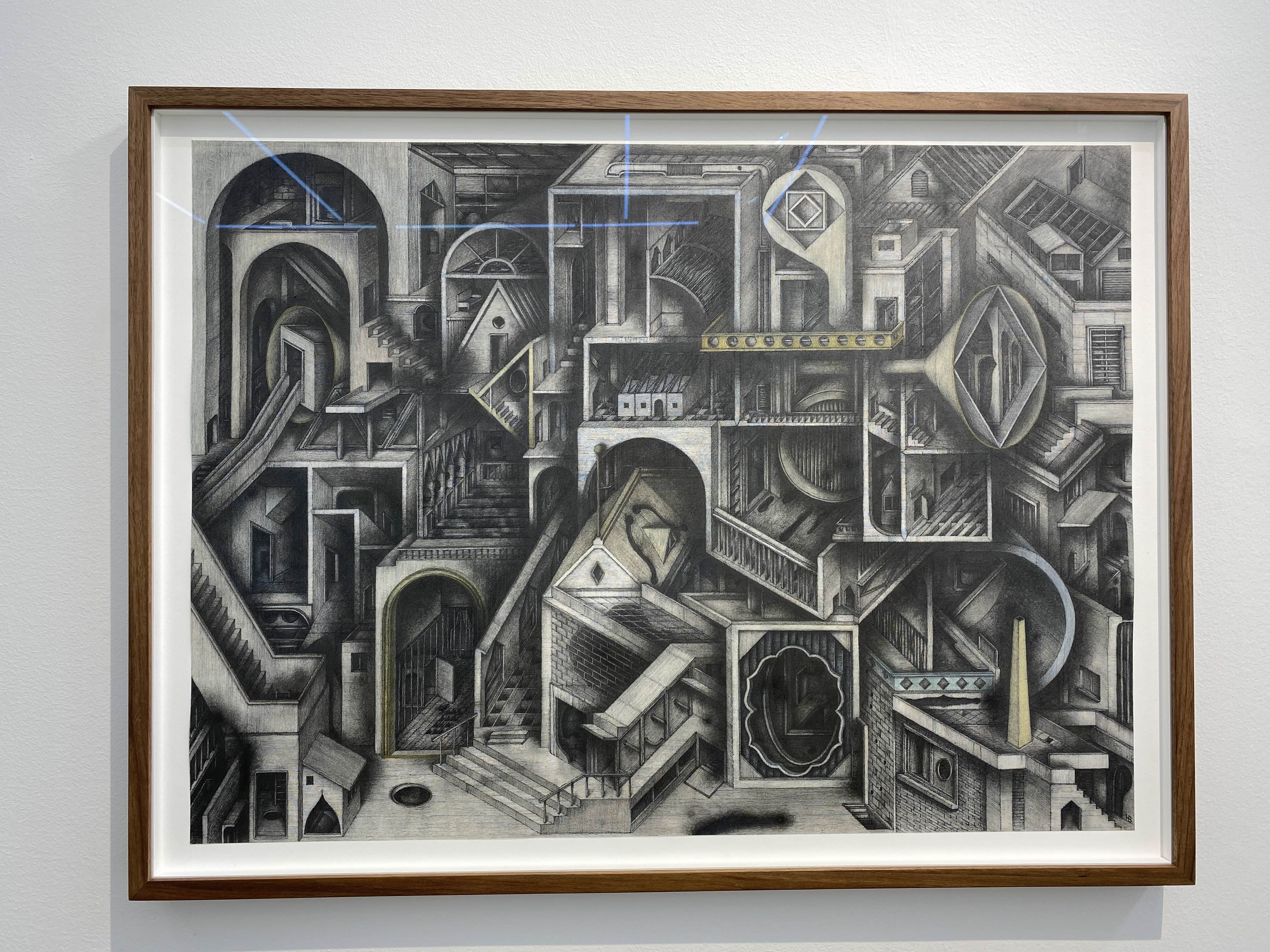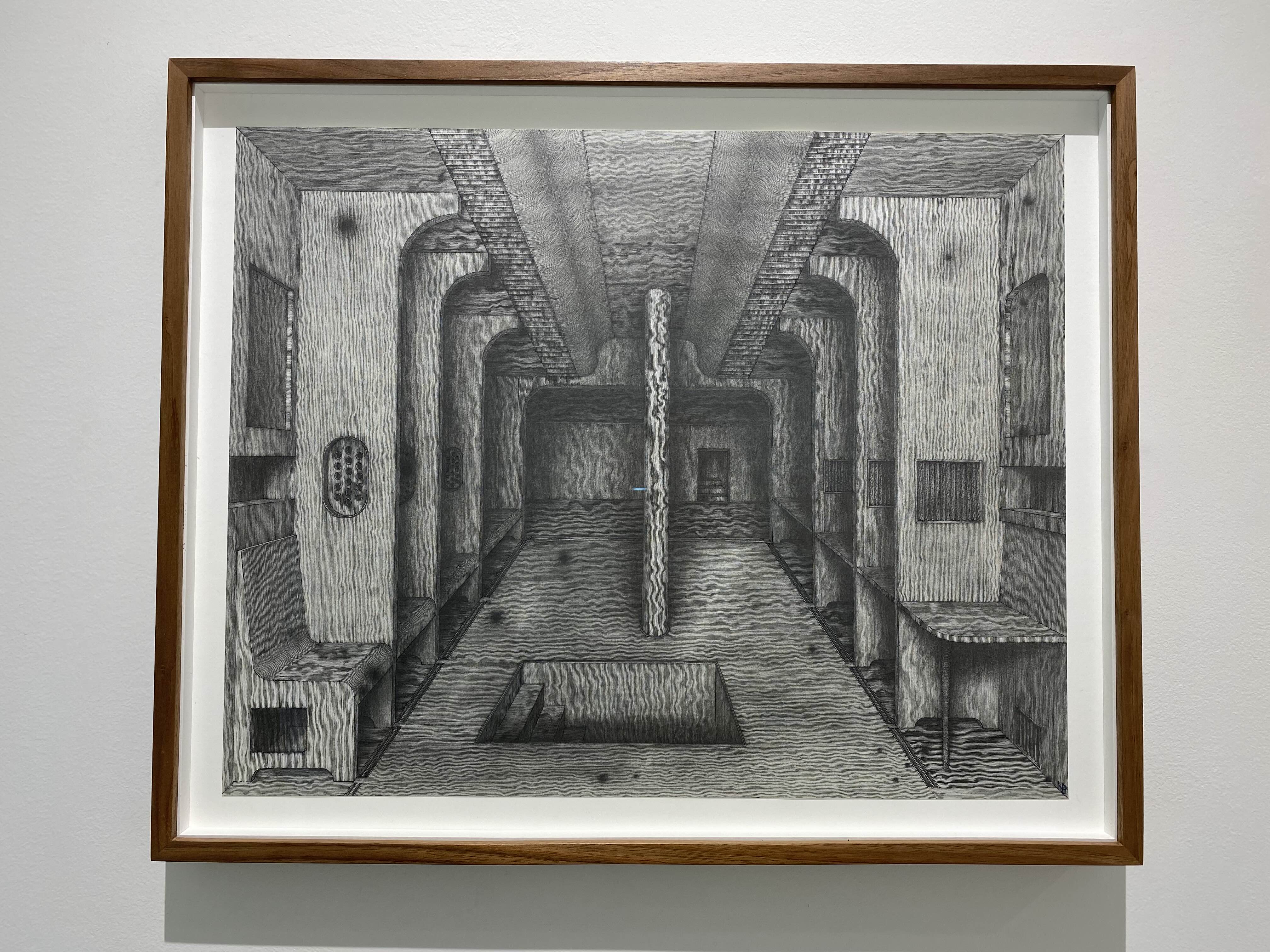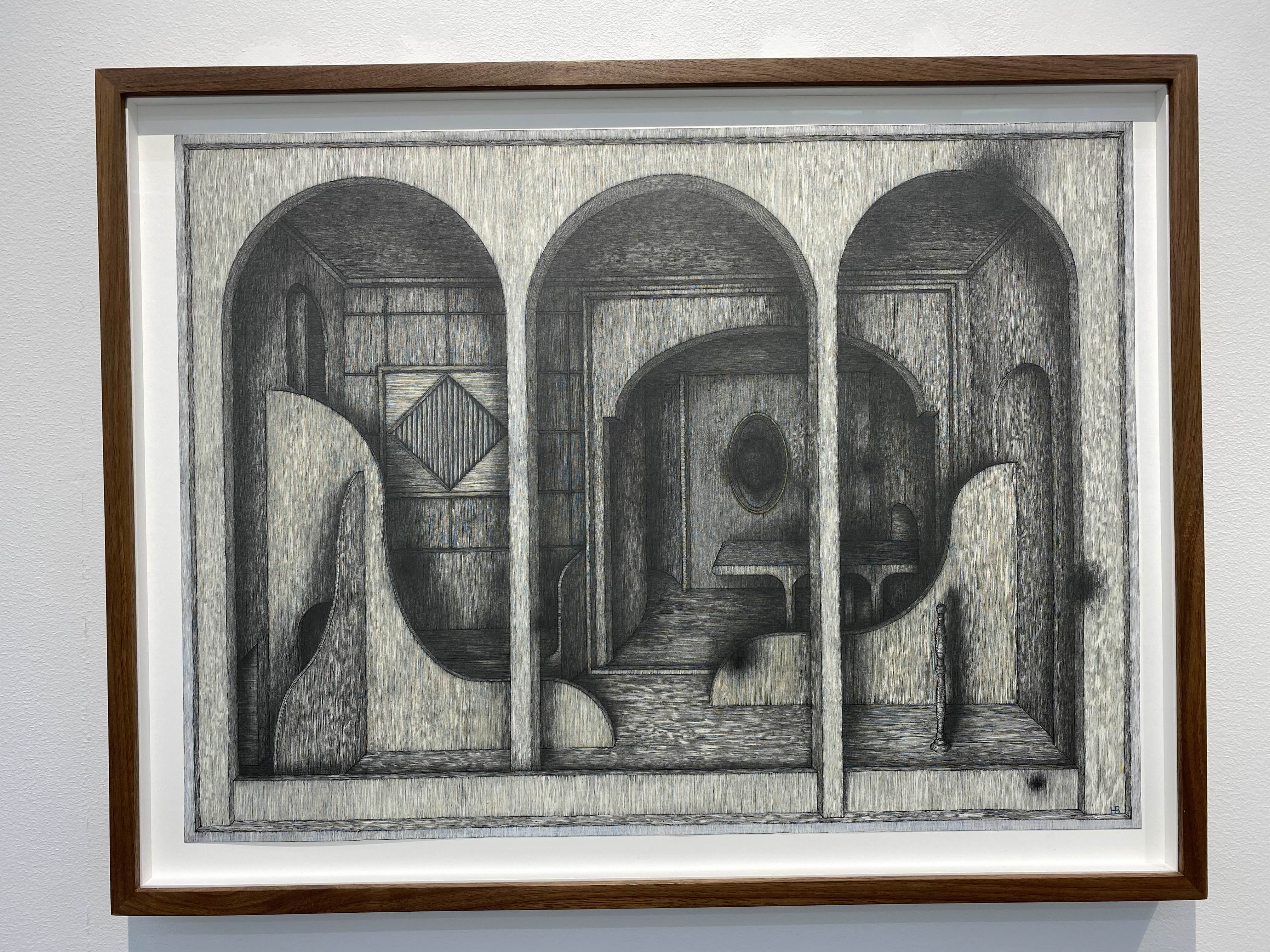 홍범의 실내 드로잉에는 작가의 깊은 사유가 묻어난다. 객석에서 바라보는 무대와 같은 공간은 작가가 느끼는 순간들의 감성, 기억되는 감각의 겹을 보여주고 있다. 드로잉에 나타나는 한 공간에서 좁은 계단이나 복도로 연결되어 다른 공간으로 이어지는 겹겹의 공간들은 작가가 기억하는 여러 순간들의 느낌이 발전해나가는 과정을 대변한다. 복잡한 구조의 실내공간은 여러 느낌들을 기반으로 각기 다른 시간대의 기억을 연결해보려는 작가의 시도인 듯하다. 홍범은 어느 한 장소에서 느낌이 다른 기억을 연결시키면서 맺어진 기억의 이미지를 재현해보고 싶었다고 한다. 기억의 방은 우리의 수많은 기억의 양만큼이나 계속해서 증식된다. 펜이나 흑연의 섬세하고 가는 선들로 그려진 실내는 신비한 이야기를 담은 기억의 방들이다.