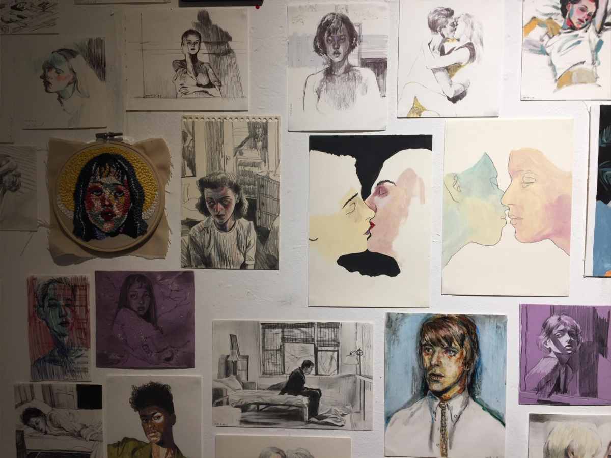 흑백, 컬러 등 다양한 스케치를 확인할 수 있습니다. 스케치 외에 자수 작품도 있습니다.