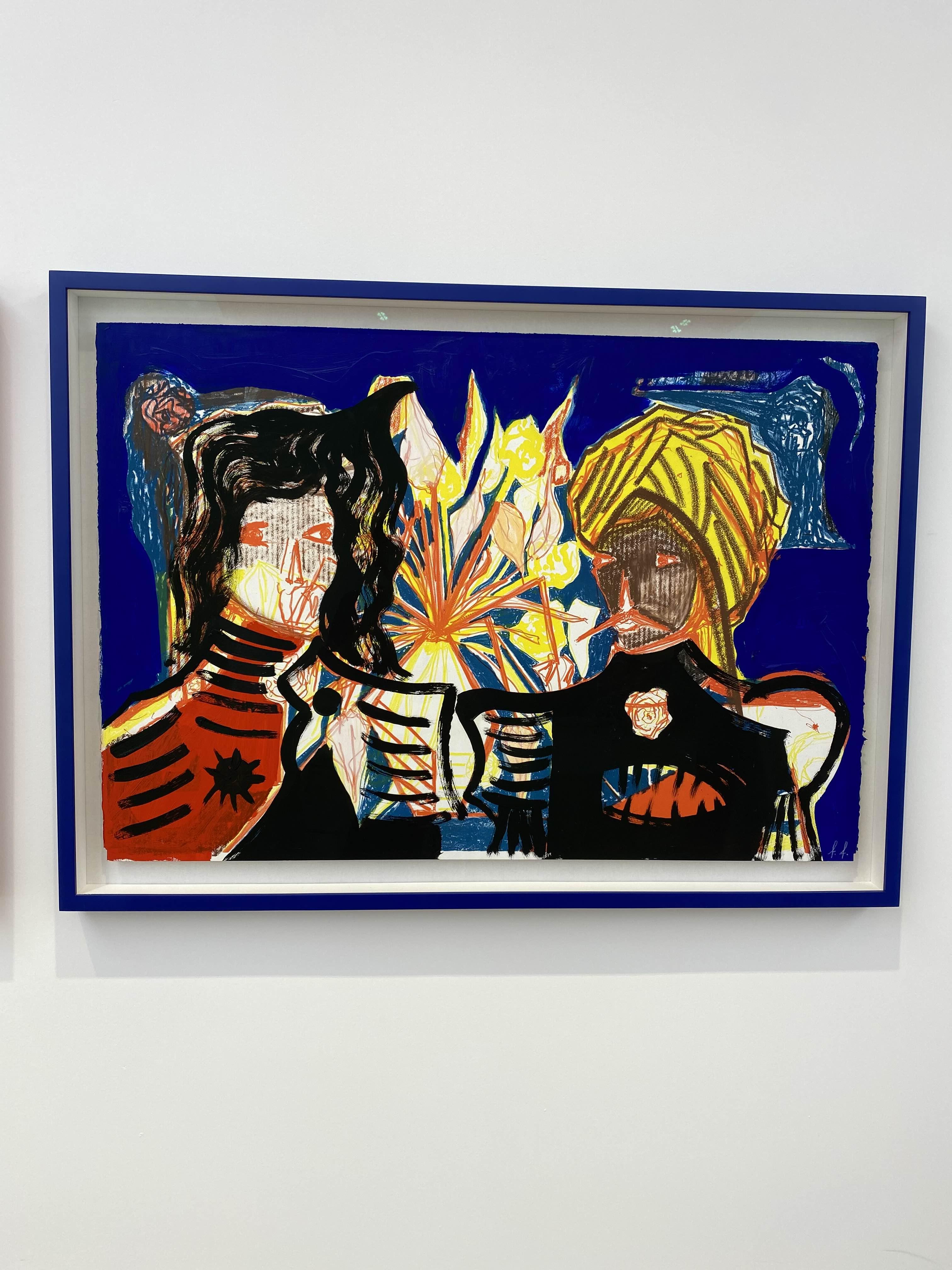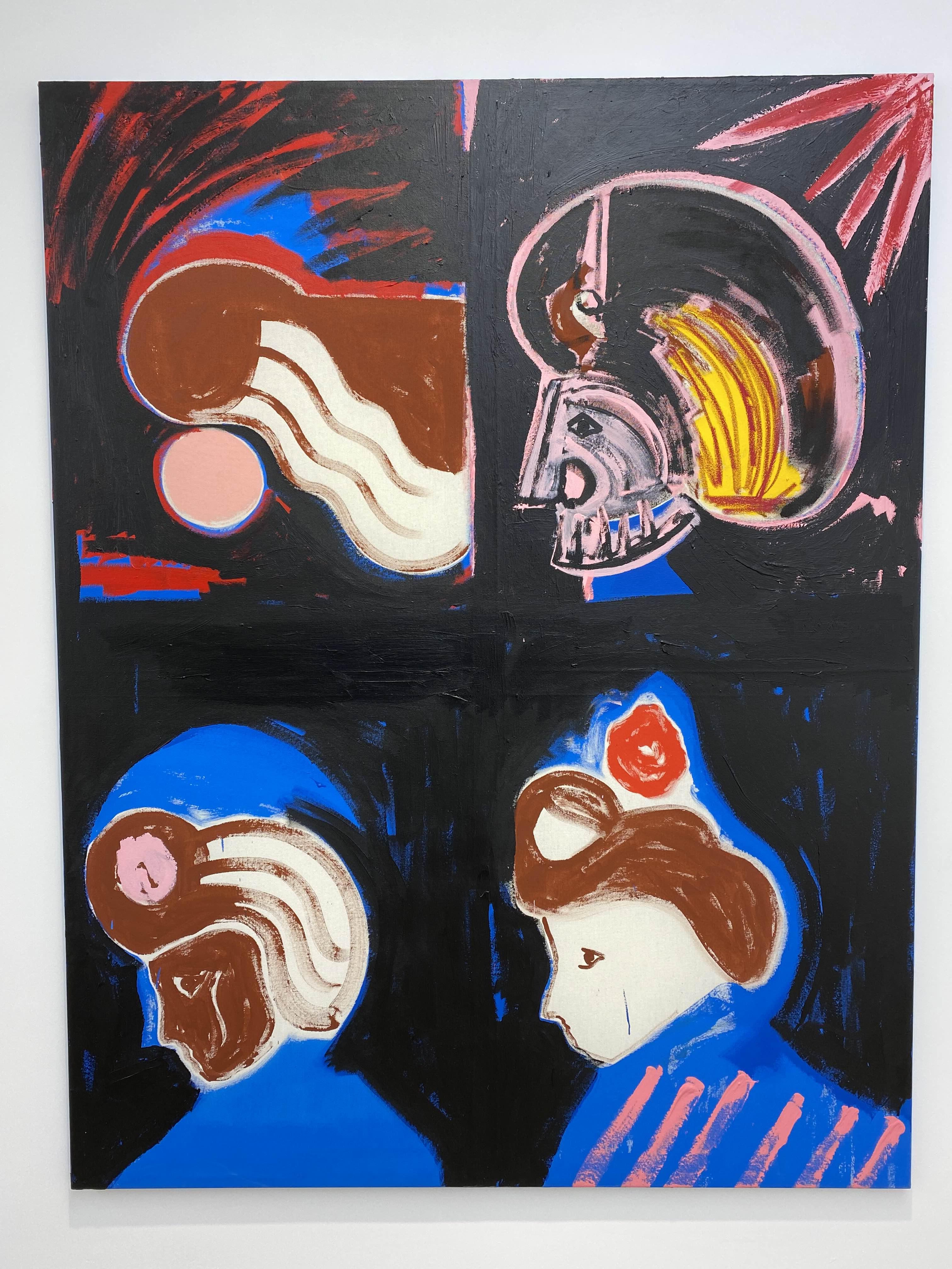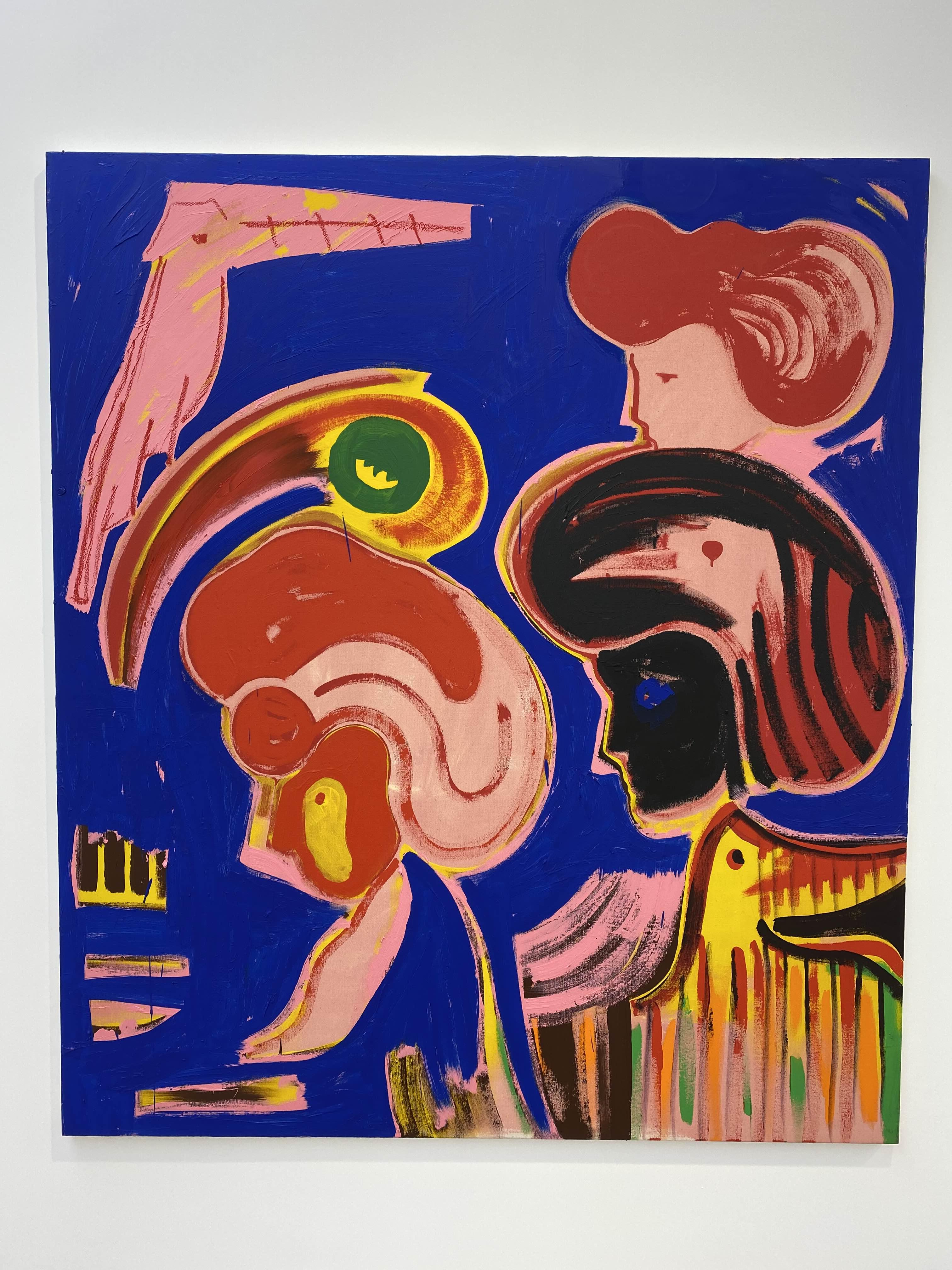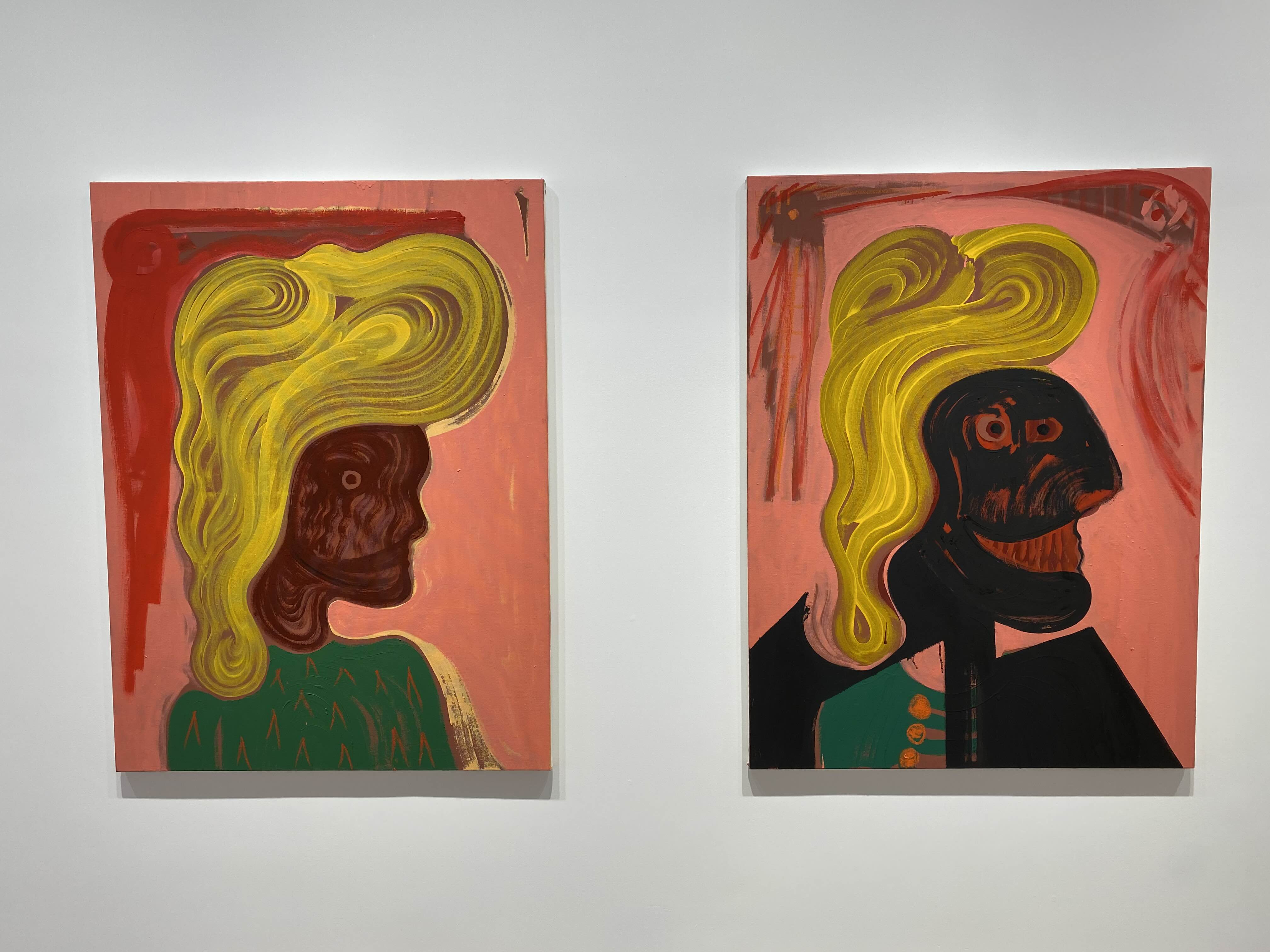 이번 전시에서는 파르잔키아가 경험한 여러 문화적 요소와 그들이 작가의 작품 세계 안에 공존하고 있는 다양한 방식이 상세히 소개된다. 조로아스터교 신화의 인물을 주인공으로 불러오는 회화(<Mithra in Darkwater>(2022), <Ahura>(2022))와 고대 중동의 벽화를 연상시키는 드로잉(<Masked Ball 1-9>(2022))에서 전통문화와의 연관을 찾아볼 수 있다면, 영국 락밴드 알란 파슨스 프로젝트의 음반 커버를 캔버스 한 귀퉁이에 그려 넣은 회화(<Atlas and the Eye in the Sky>(2022))나 미국의 싱어송라이터 프린스의 무대 의상과 파스빈더의 대표작 <페트라 폰 칸트의 쓰디쓴 눈물>(1972) 속 한 장면을 연상시키는 금발 머리 인물들의 초상화(<Prince in Black>(2022), <Figure in Green>(2022))는 서양 대중문화에 대한 작가의 관심과 지식의 깊이를 가늠해 볼 수 있게 한다. 작가는 상이한 배경에서 온 형상과 구성을 과감하게 한데 묶어 생경함과 익숙함을 동시에 선사하는 화면을 구성해내기도 한다. 가령 터번을 쓴 사람의 옆얼굴이 반복적으로 등장하는 <Guardsmen>(2022)에서 그림 속 인물의 생김새나 옷차림은 고대 페르시아의 문화를 즉각적으로 연상시키는 데 반해, 화면을 분할하고 그 위에 형상을 반복적으로 배치하는 구성은 서양 현대 미술이나 그래픽 디자인에 자주 등장하는 형식을 떠오르게 한다.