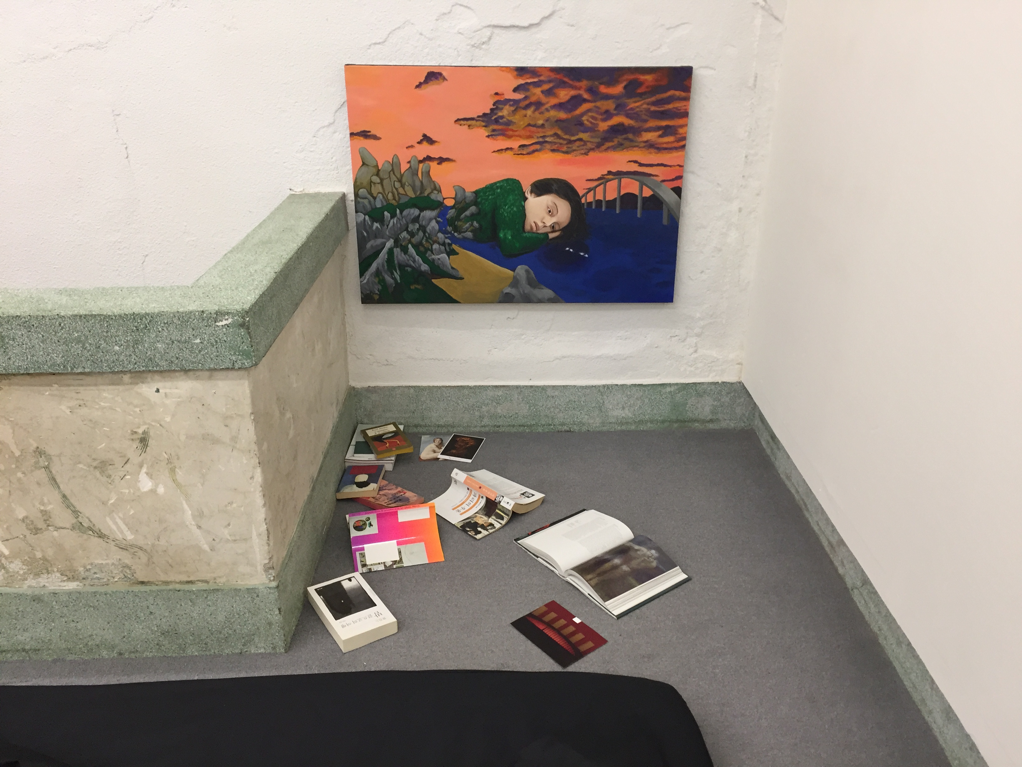 눈을 뜨자 바닥에 책들이 널브러져 있다. 침대 건너편에 걸려있는 누워있는 그림과 가로누워 가만히 서로를 바라본다.