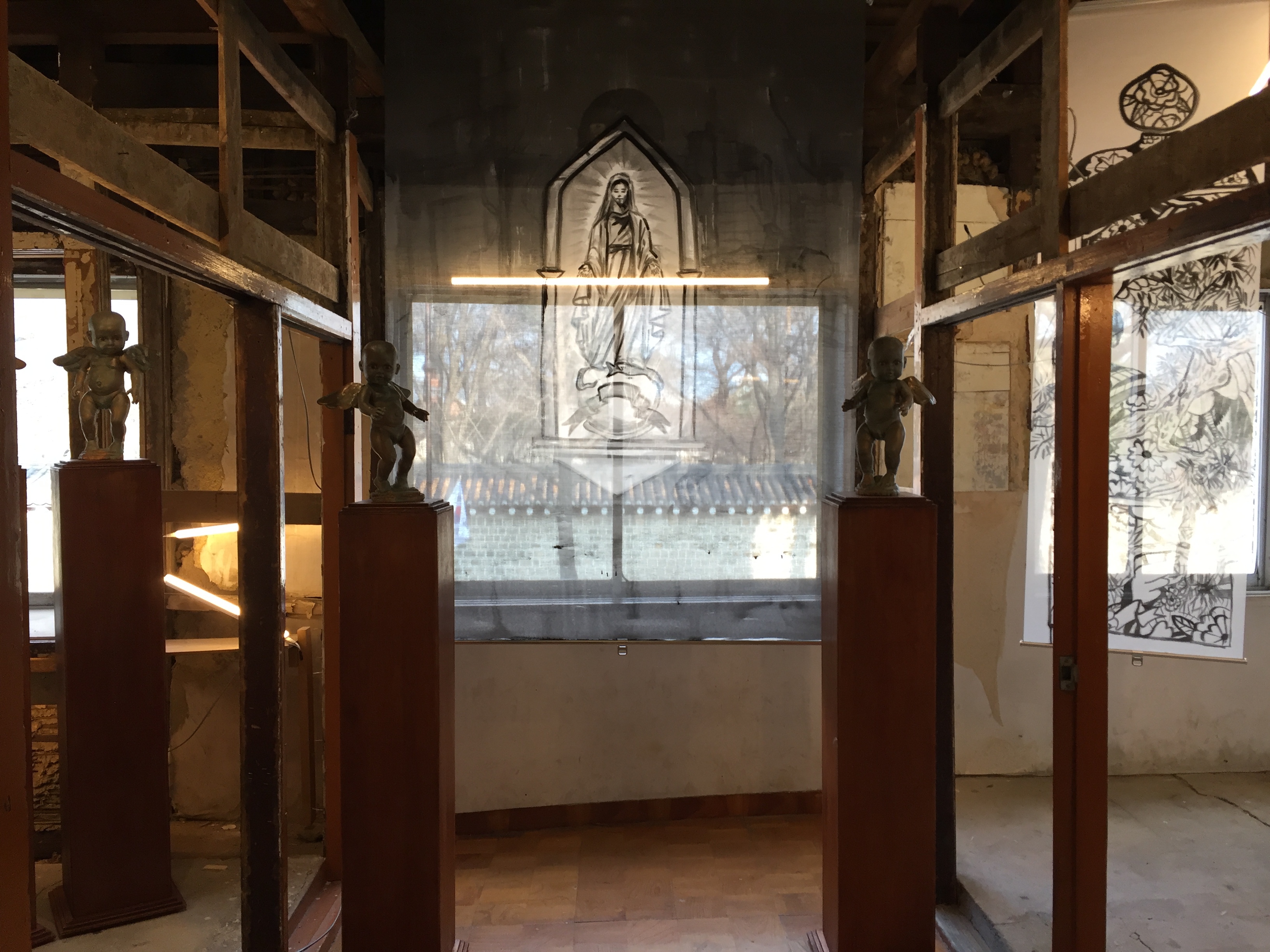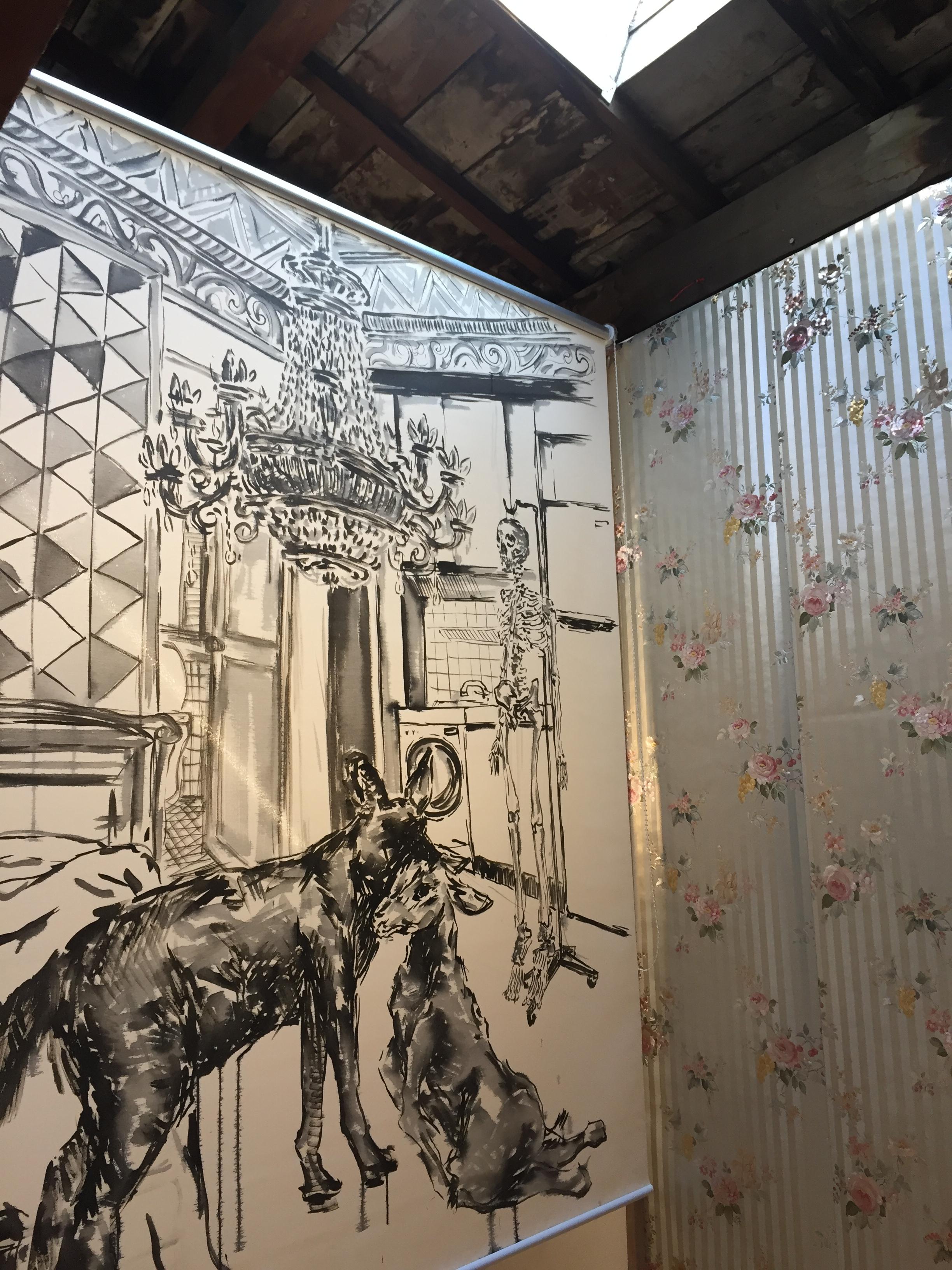 보안여관. 그 이름값은 꽤 하지만 이런 전시장 또 없다. 나무로 골조를 세우고 흙과 지푸라기와 모래 시멘트로 만든 건물 위에 80년 동안 덧댄 엉성한 건축재료들은 곳곳이 뜯겨나가 마지막에 붙여졌을 벽지는 거의 허공에 떠있고 한 세기 동안 모아든 먼지가 굴러다닌다. 건물이 웬만한 작품보다 연륜과 기가 세서 영리한 작가와 기획자들은 작품에 골몰하기보다 연출에 꾀를 내기 바쁘다. 그렇게 되면 결과적으로 공간의 지위만 더 높아지기 쉽다. “어차피 다 스러질 것들이야. 나처럼. 도대체 무슨 영광을 위해서 이런 짓을 하는거니?” 여관이 이렇게 외치는데도 작가들은 그 말을 듣지 못한다. 그래도 사대문 안에 이 정도 기거할 공간이 있는 것만 해도 감사하다. 특히 허무 버무린 블랙코미디를 주로 그려온 서찬석 작가에게 이 공간은 그림 속 내용을 공간을 통해 이중으로 증명할 기회를 주었다.