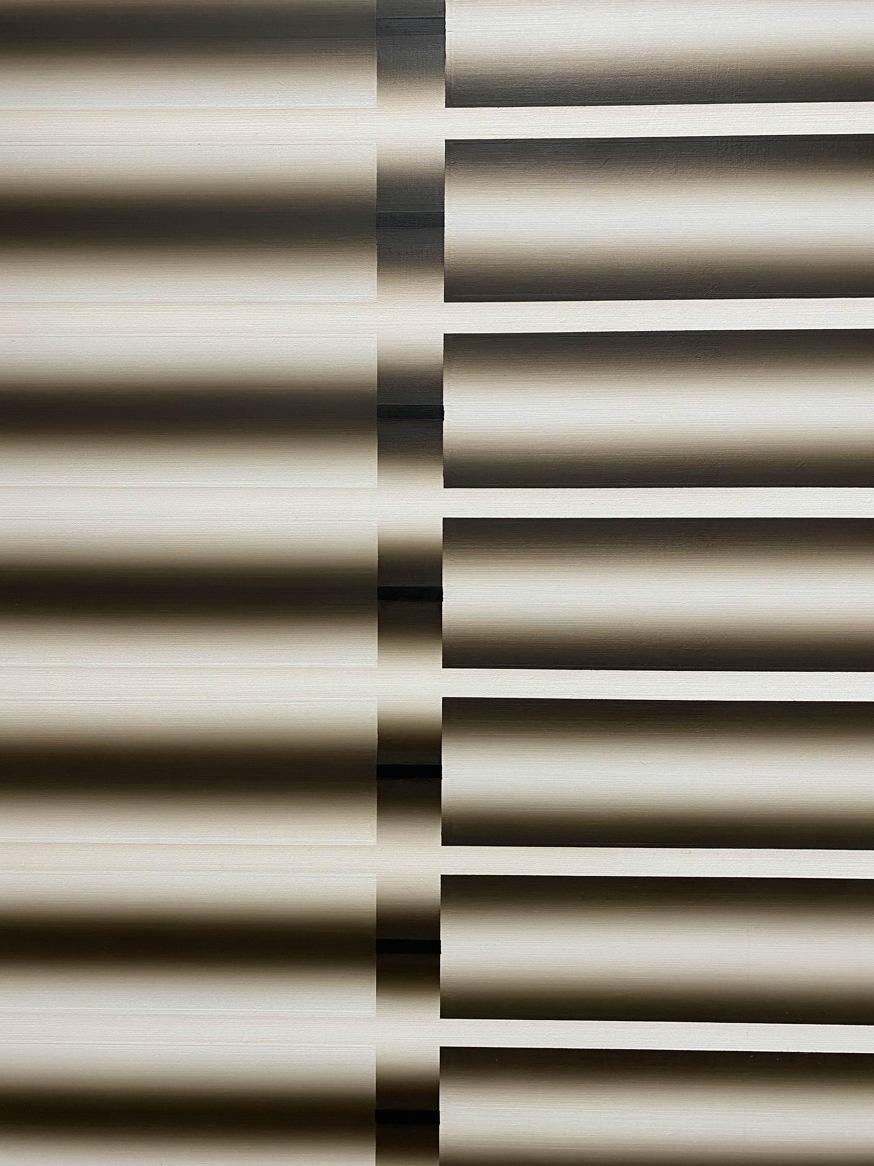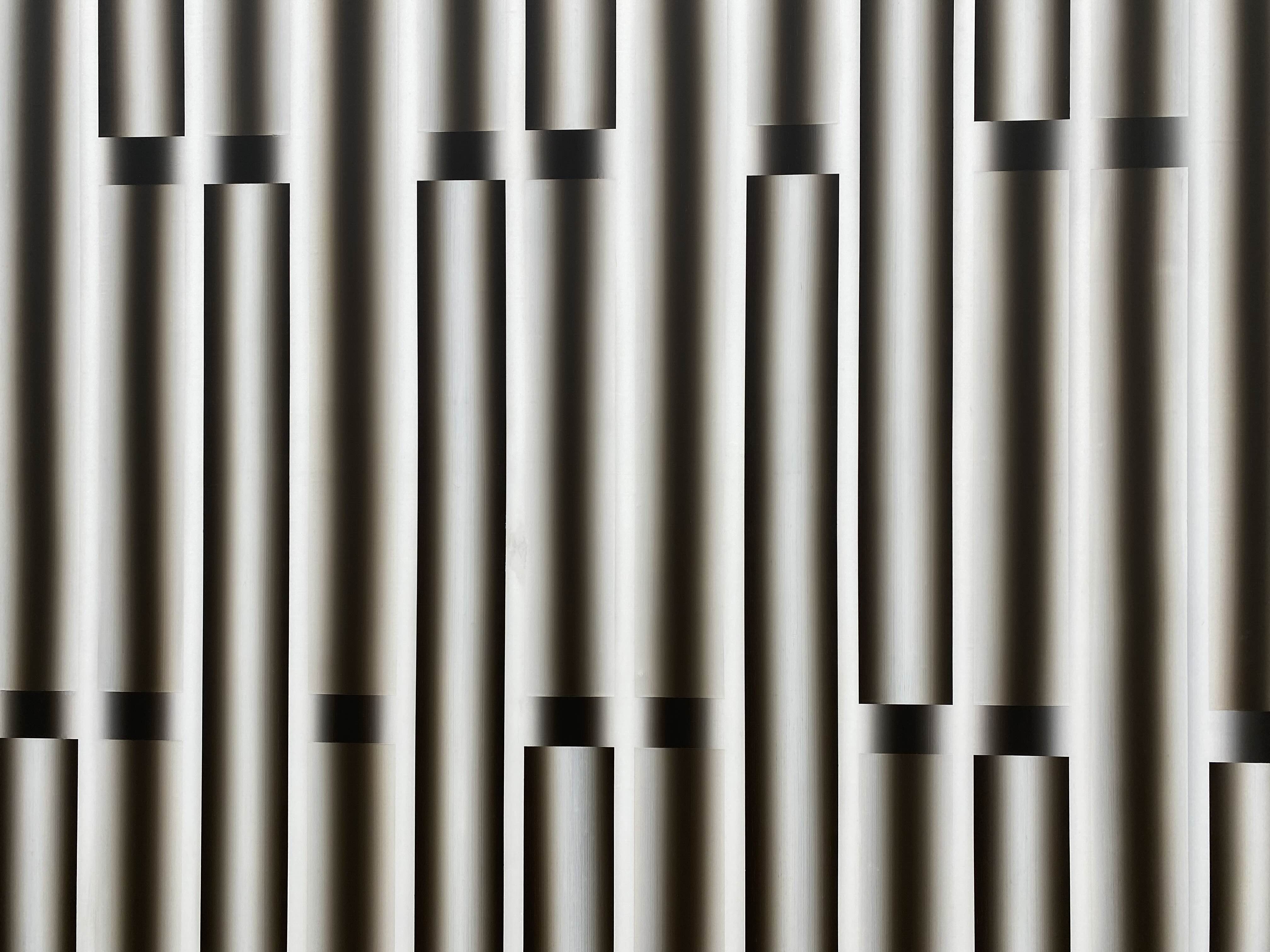 이승조의 가장 대표적인 모티프로 알려진 ‘파이프’ 형상이 처음 등장한 것은 그로부터 4개월 후, 〈핵〉 연작의 열 번째 작품을 통해서였다. 마스킹 테이프로 캔버스에 경계를 지정한 뒤 납작한 붓으로 유화를 입히는데, 붓의 가운데 부분에는 밝은 물감을 묻히고 양쪽 끝에는 짙은 색 물감을 묻힘으로써 각 색 띠의 한 면을 한 번에 그을 수 있었다. 이러한 붓질을 반복하는 과정에서 자연스레 색 간의 경계가 사라짐과 동시에 그라데이션이 생겨나 3차원적 입체감이 형성되는데, 색을 칠한 후 작가는 사포질을 통해 화면을 갈아 윤기를 내어 금속성의 환영을 더했다.