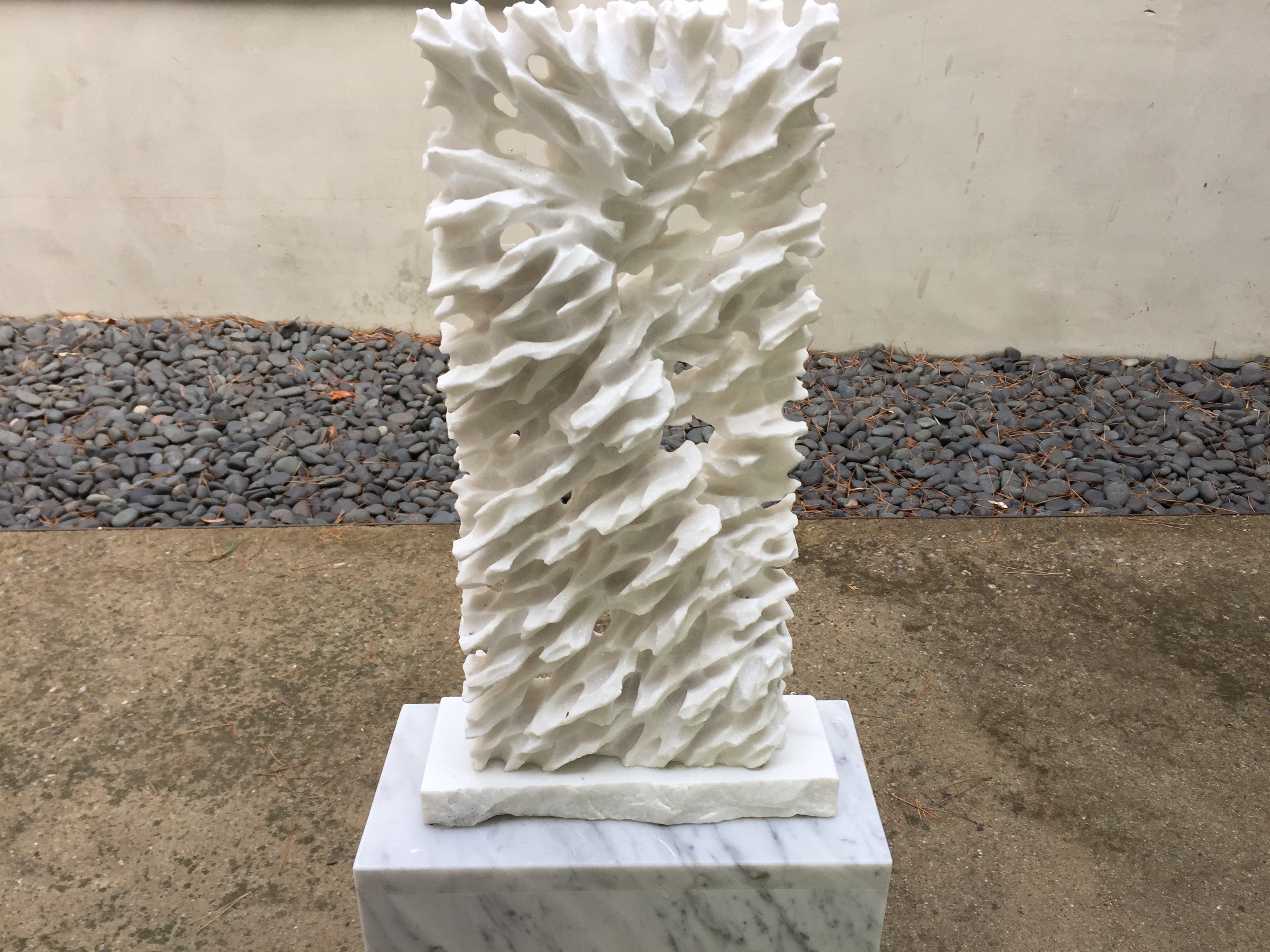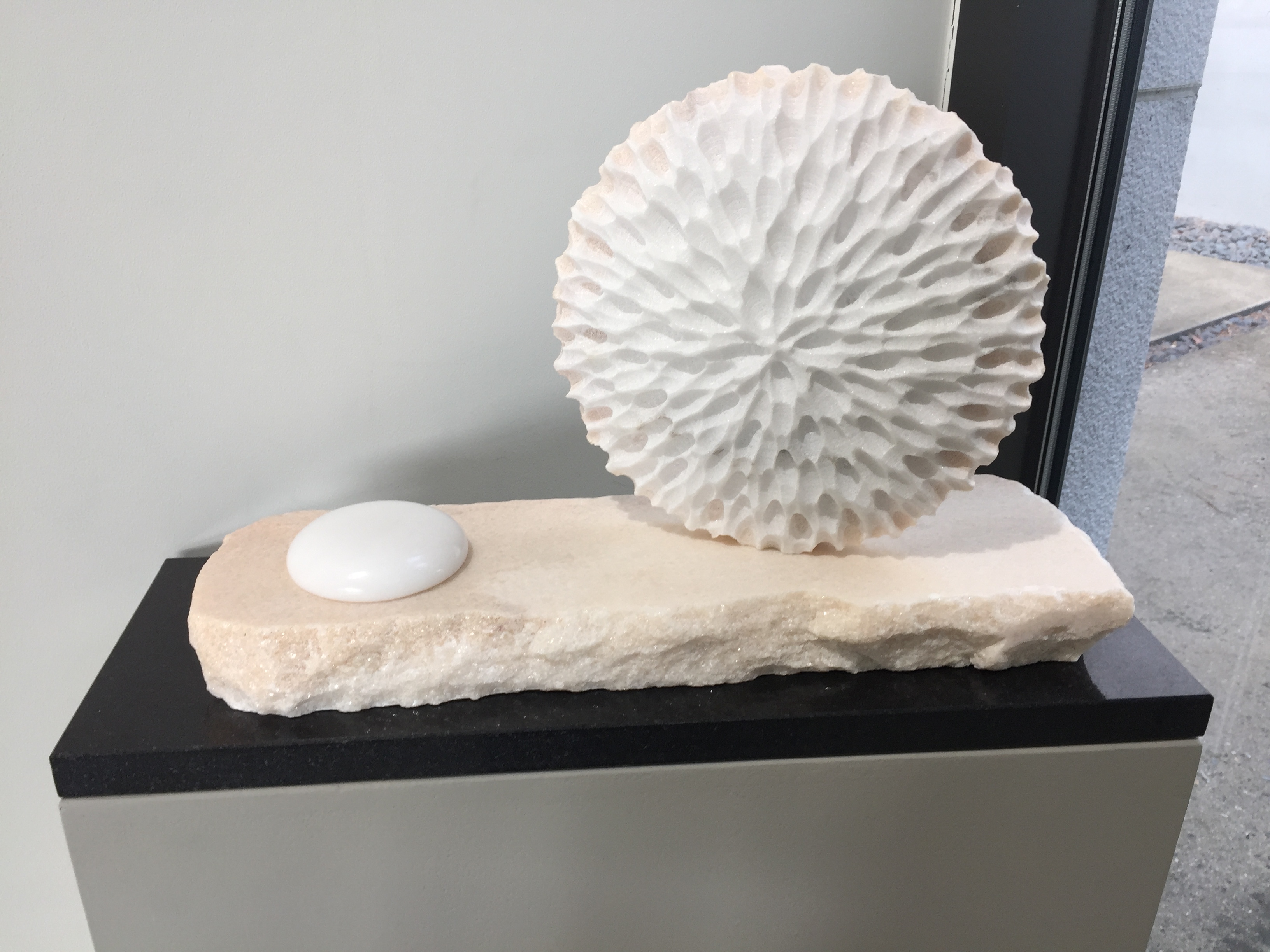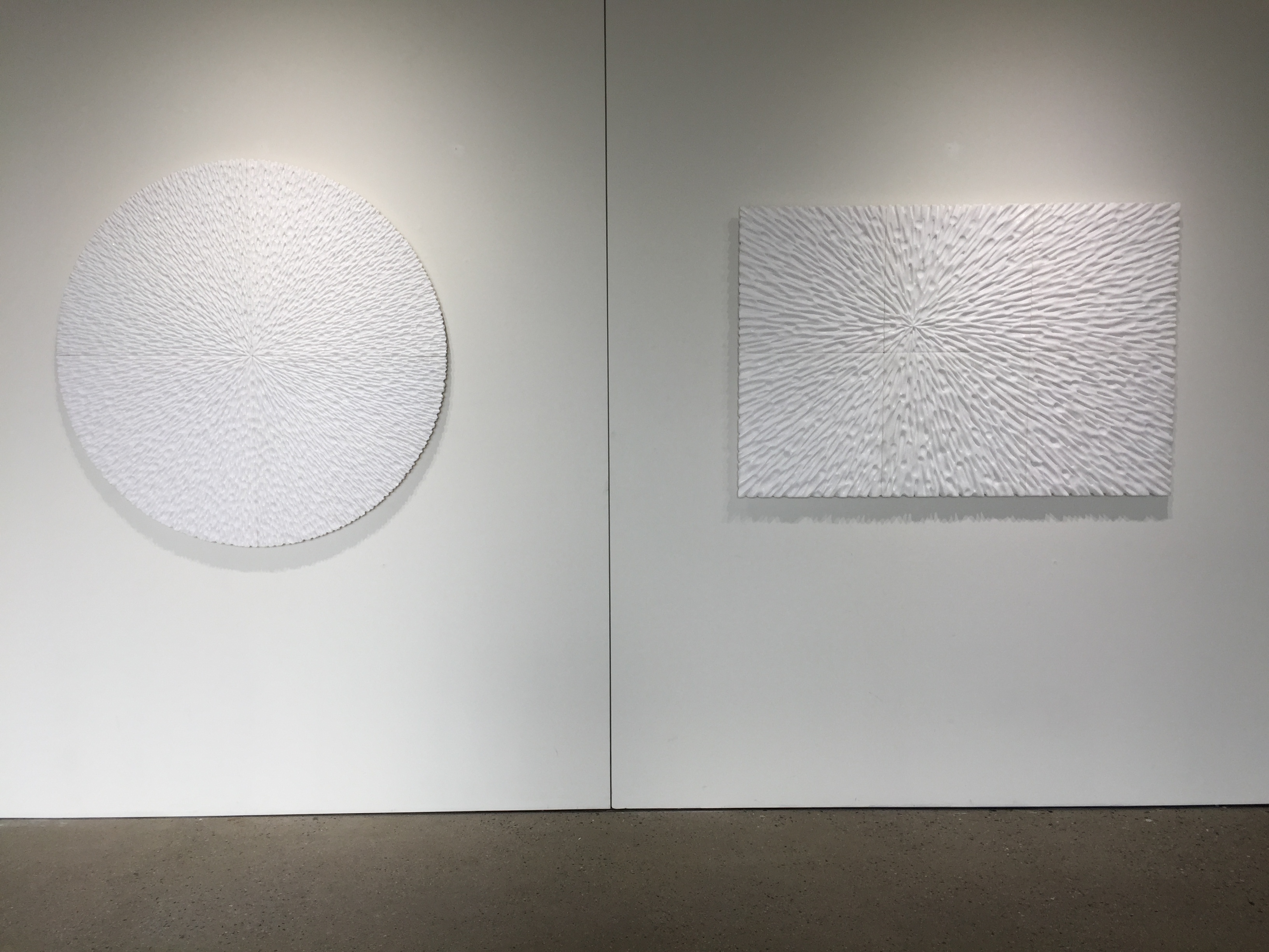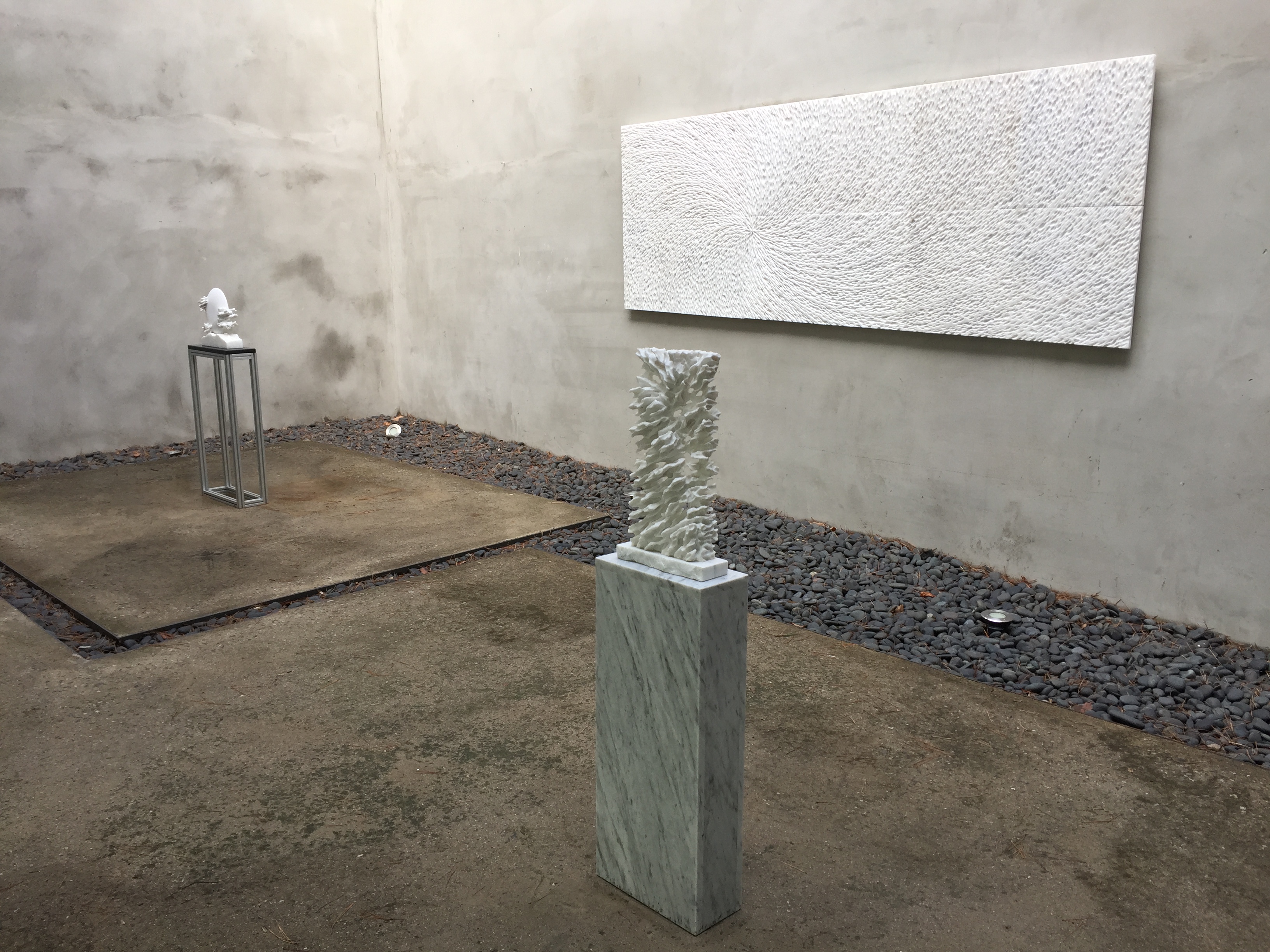 백진기는 돌의 숨결과 성결을 누구보다 잘 알고 있음에도 늘 조심스럽다. 어루만지듯 따라 들어가고 그들의 화답에도 민감하게 반응한다. 일정한 방향성과 함께 맺힘을 보이는 이유다. 때론 칼로 나무를 쳐내듯 단호하게 끊어 치고 내리친다. 마치 흑백의 강렬한 목판화를 보는 듯 칼맛나는 표면질감이 눈길을 사로잡는다. 원과 반듯한 사각형을 중심으로 한, 이른바 부조작업은 우주의 질서와 기운, 신성과 종교적 절대 미감, 숭고미 등을 연상케 한다.