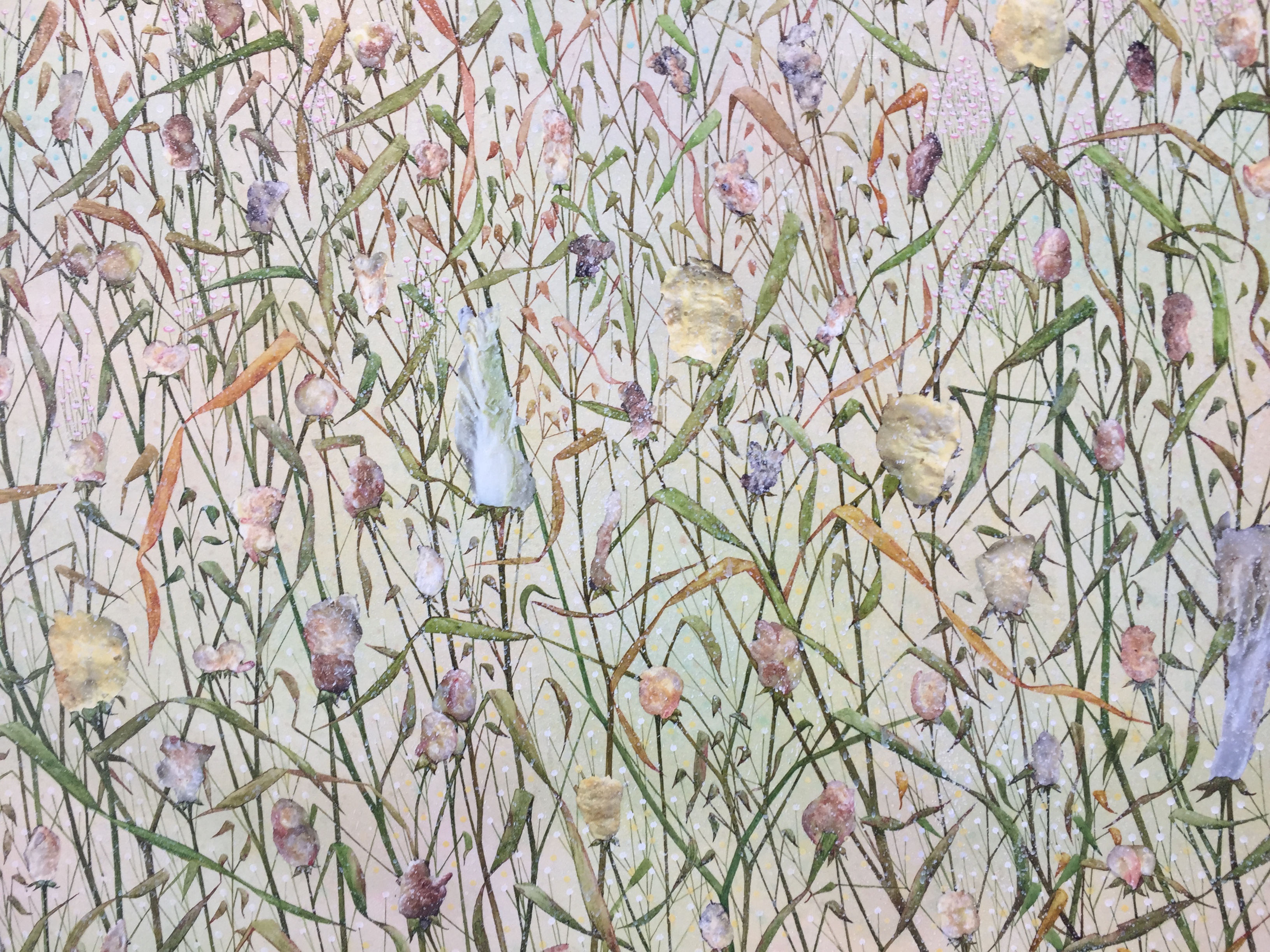송하나는 전단지 속 상품 이미지를 오려내고 그것을 다시 오브제화한 후 지지체에 얹어나가는 특유의 제작방식과 형식을 통해 일상 속에서 경험한 에피소드를 진솔하게 펼쳐왔다. 마치 공작이 깃털을 펼친 듯 이야기 가지를 펼치고 이어간 송하나의 제작 방식은 평소 깊이보다 넓이를 강조하는 그의 오랜 소신을 읽을 수 있는 대목이기도 하다. 송하나의 이런저런 화면 속에는 딸로서 주부로서 아내로서 엄마로서 살아내는 삶의 풍경과 가쁜 숨이 상징적으로 켜켜이 중첩되어 있다.