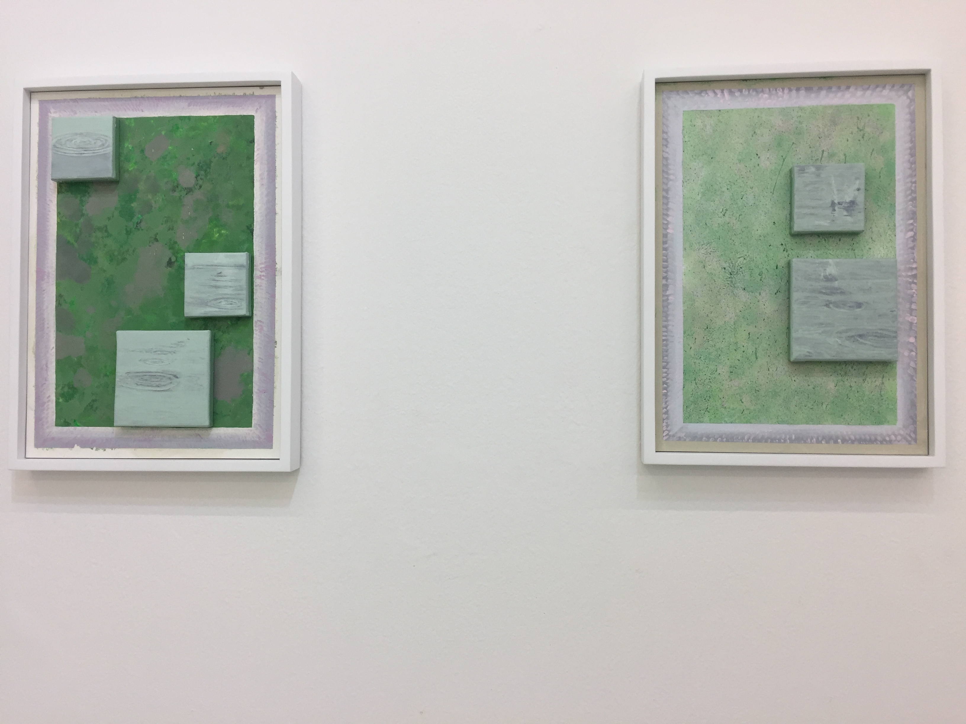 Pebble Skipping으로 번역되는 물수제비는 납작한 조약돌을 수면 위로 던지면서 조약돌이 얼마나 많이 수면 위를 튀기는지 보는 것이다. 그리고 일반적으로 ‘얼마나 많이’는 조약돌의 이동을 직접적으로 보기보다는 그것이 남기는 동심원 모양의 물결 수를 보고 확인된다. 포물선의 궤적을 그리면서 튀어 오르는 조약돌은 가라앉기 전까지 물결을 만들어내는 동시에, ‘물수제비를 뜬다’라는 표현처럼 물 표면에 작게 파인 홈을 만들어낸다. 말하자면 이 작게 파인 홈이 물결의 시작이 되는 것이다. 그가 이번 전시에서 보여주는 작품들 역시 풍경-작업실-전시장의 궤적으로 이동했던 이미지들이 남긴 흔적이다. 마치 물수제비에서 하나의 동심원이 다른 동심원과 만나 또 다른 물결로 섞이듯이 그것들은 서로 뒤섞인다. 캔버스의 흰색에서 물감의 채색과 바니쉬까지 색채들이 얇게 켜켜이 쌓이고 겹쳐지면서, 뒤섞인 이 흔적은 그의 회화가 쉽사리 미끄러지지 않도록 마찰을 일으킨다. 임노식 작가는 풍경-작업실-전시장이라는 세 공간의 흐름이 어떻게 캔버스에 담기는지에 이어 이것이 어떻게 전시장에서 보여질 수 있는지 주목한다. 회화 프레임의 사각형을 유지하되 그는 이 사각형이 어떻게 전시공간과 마주하는지, 아니 정확하게 말하면 전시장 내에서 회화 자체가 공간이 될 수 있는지까지 고민을 던진다. 이 답에서 그의 회화는 호를 그리거나 혹은 벽과 기둥과 같은 형태로 존립하게 된다. 여기에서 일반적으로 화이트 큐브의 공간으로 간주되었던 창문과 천장의 보, 그리고 전시장 입구도 하나의 프레임으로 작동하게 된다.