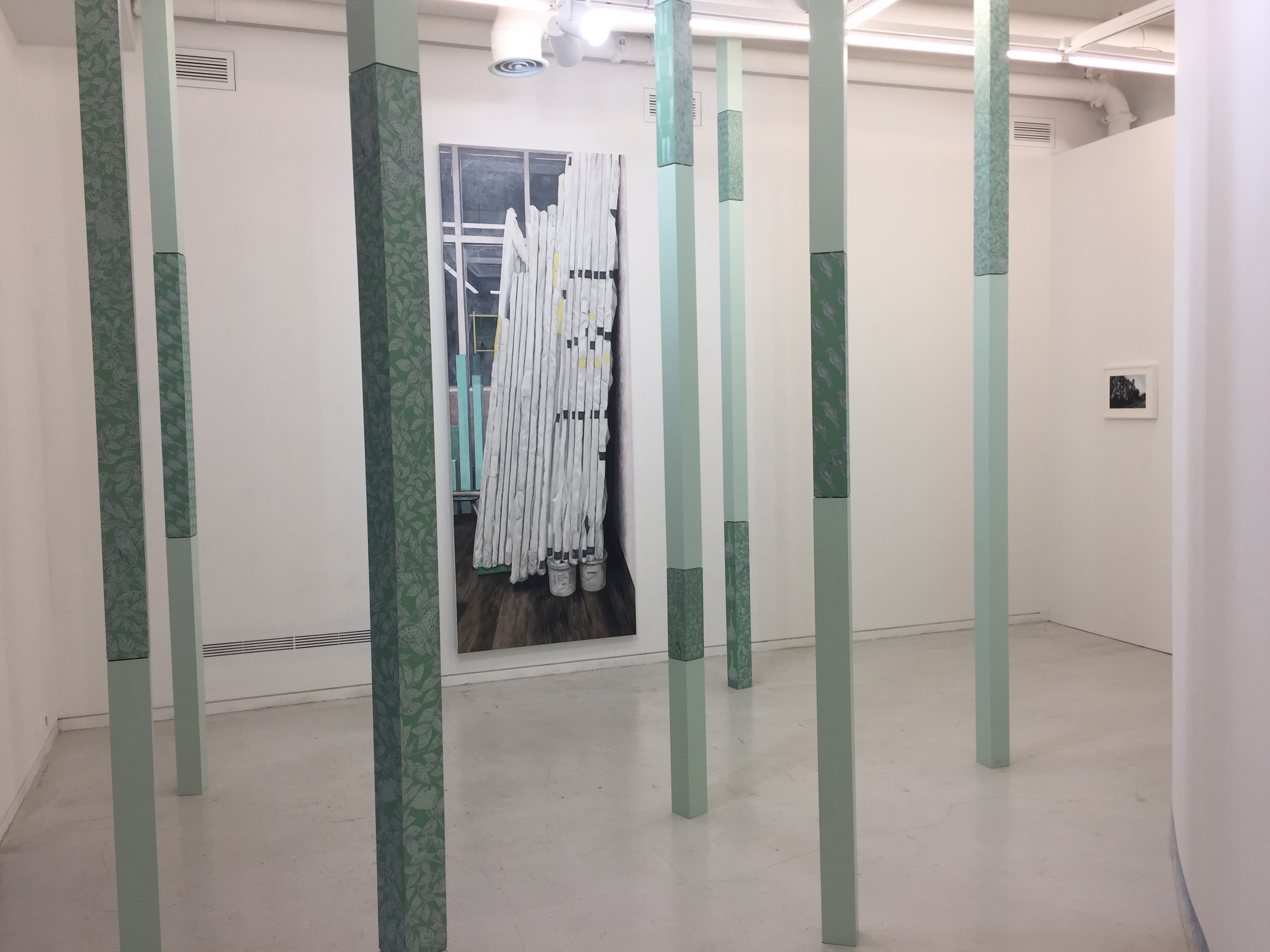 전시장에 곡선이 있는 가벽으로 분리되어 있습니다. 여러 전시장을 다니면서 회화 전시에 공간이 분리된 적이 거의 없었던 것 같습니다. 분리된 곳을 보면 나무로 기둥이 세워져 있고 기둥마다 그림이 있습니다. 새도 있고 꽃도 있고 식물도 있고 다양합니다. 분리되어 있어 하나의 전시이만 또다른 전시를 보는 듯한 느낌이 들었습니다.