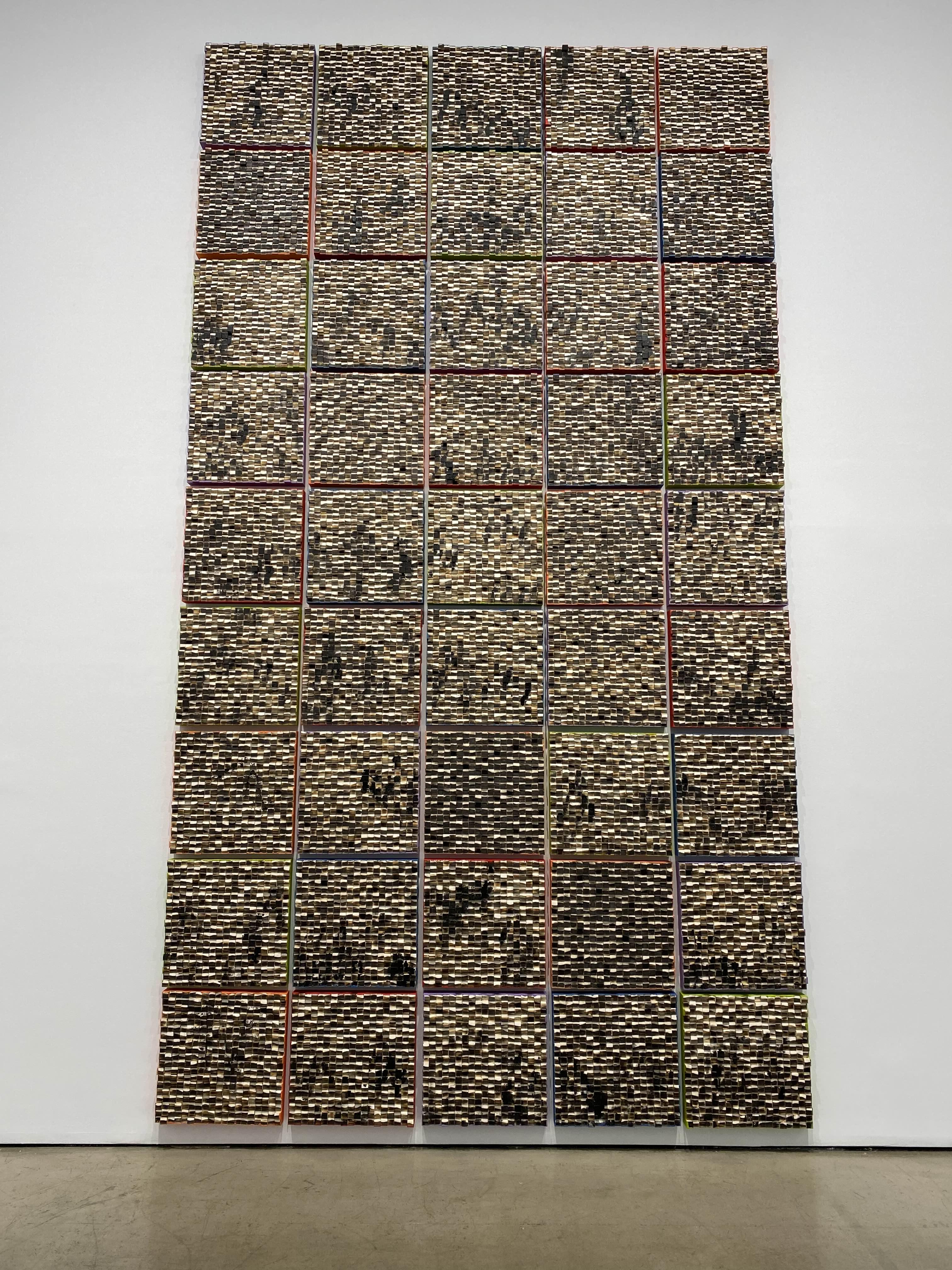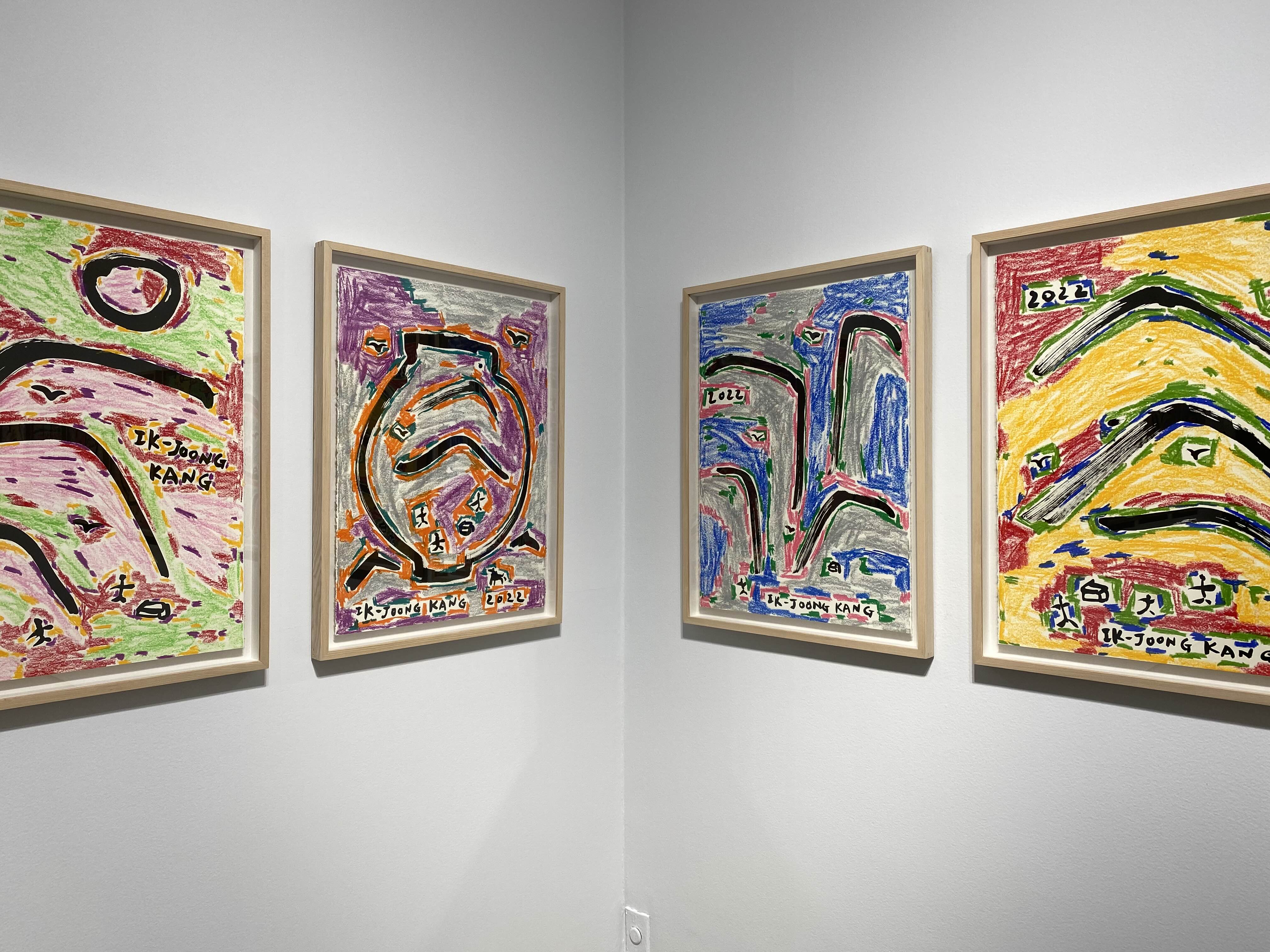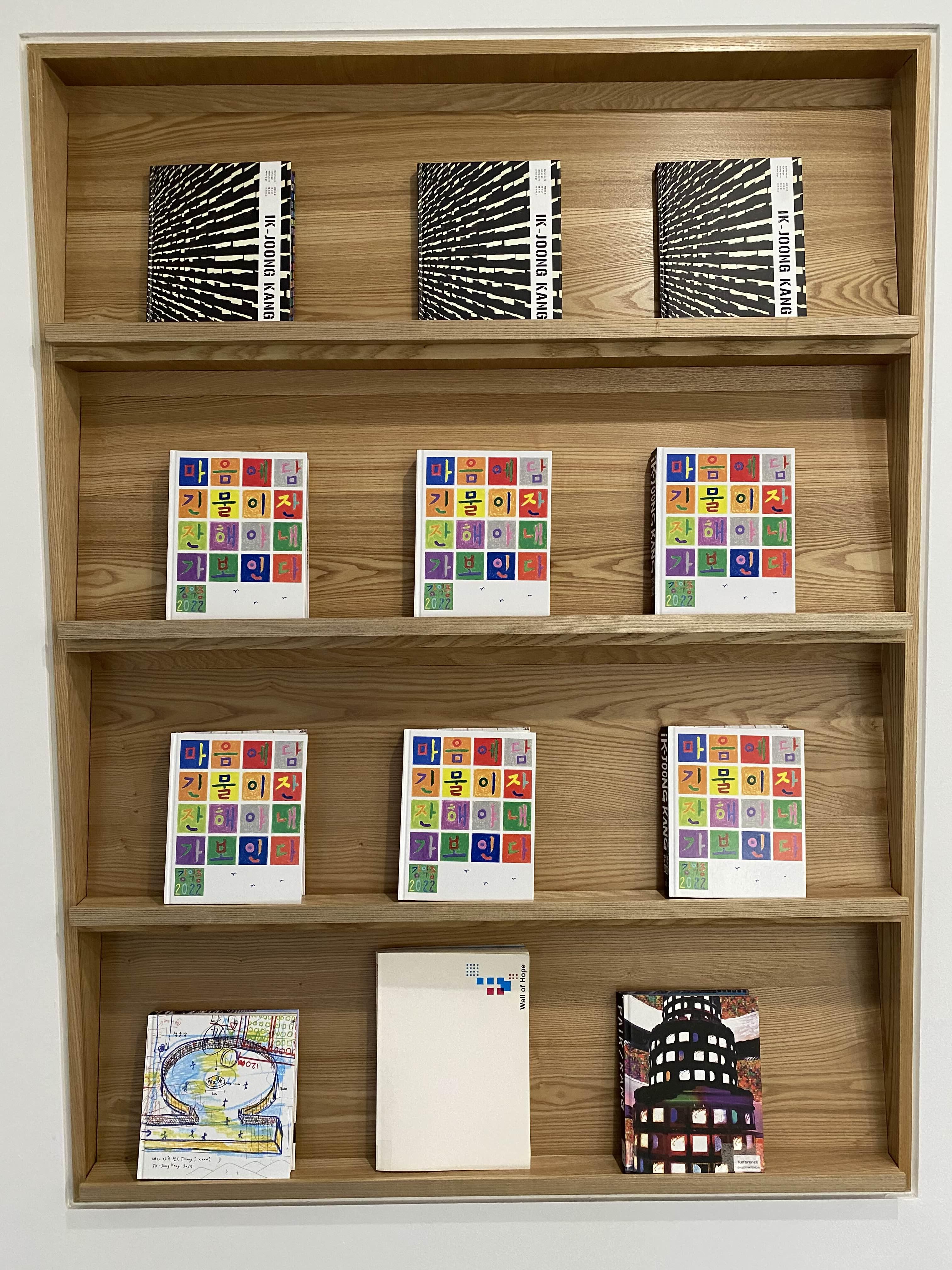 2층 전시장은 ‘산’과 ‘자연’이 테마인 작품을 통해 인간과 자연의 화합을 중요시하는 강익중 작가의 생각을 확인한다. 전시장에 수평으로 나란히 걸린 30여 점의 드로잉 연작 <달이 뜬다>는 전통 산수화를 강익중의 시선에서 재해석한 신작이다. 먹을 사용해 산과 들, 달과 폭포, 달항아리, 사람과 집, 새와 강아지 등을 함께 그려 넣고 그 바탕을 다채로운 색의 오일 파스텔로 칠했다. 경쾌한 색의 조화와 자유로운 획의 흐름이 강조된 드로잉 연작에는 즐거운 태도로 작업에 임하는 강익중의 예술가적 태도와 정서가 담겼다. 48 x 48 cm의 개별 작품이 군집을 이뤄 약 4.5m 높이로 설치된 <산> 연작은 수묵산수화를 보는 듯 장엄한 풍경을 연출한다. <산> 연작은 높이가 다른 작은 나무 조각에 아크릴 물감으로 산의 곡선을 그리고 모아 붙인 뒤 표면을 불로 태우거나 그을려 세월의 흔적을 간직한 듯한 산세를 형상화하는 방식으로 완성된다. 패널의 사이드에 칠해진 색들은 산에서 맞는 사계절의 흐름을 시각화한다. <산> 연작과 함께 놓인 설치 작품 <우리는 한 식구>는 전시장 구석에 낡은 밥그릇 500개를 뒤집어 산처럼 쌓았고, 그 사이로 DMZ 지역에서 녹취한 새 소리가 흘러나와 전시장에 울려 퍼진다. 작가는 마치 밥을 함께 먹듯이 일상에서 기쁨과 슬픔을 나누는 ‘우리’를 ‘식구’라고 칭하며, 남과 북, 가족과 민족의 개념을 환기한다.