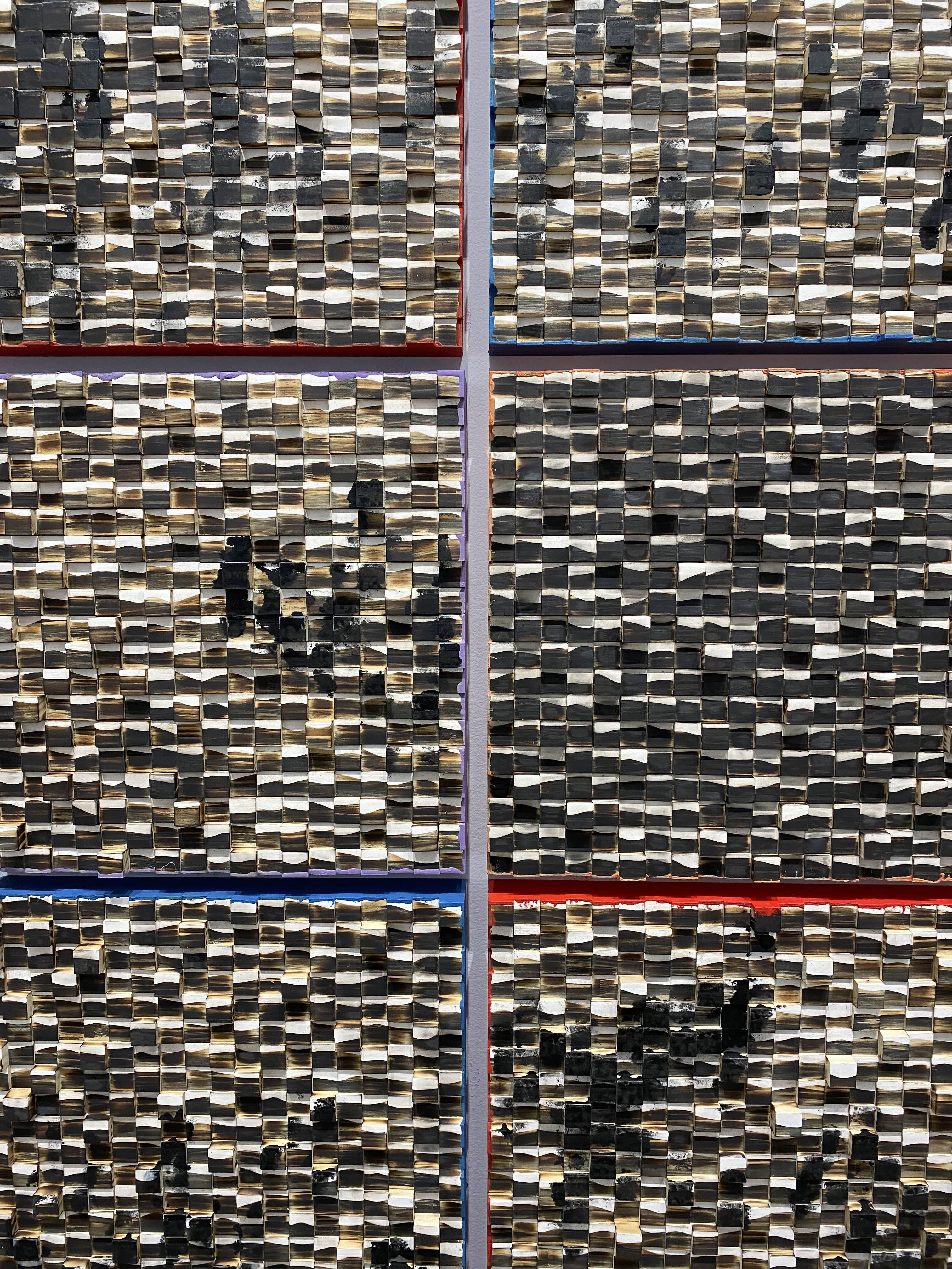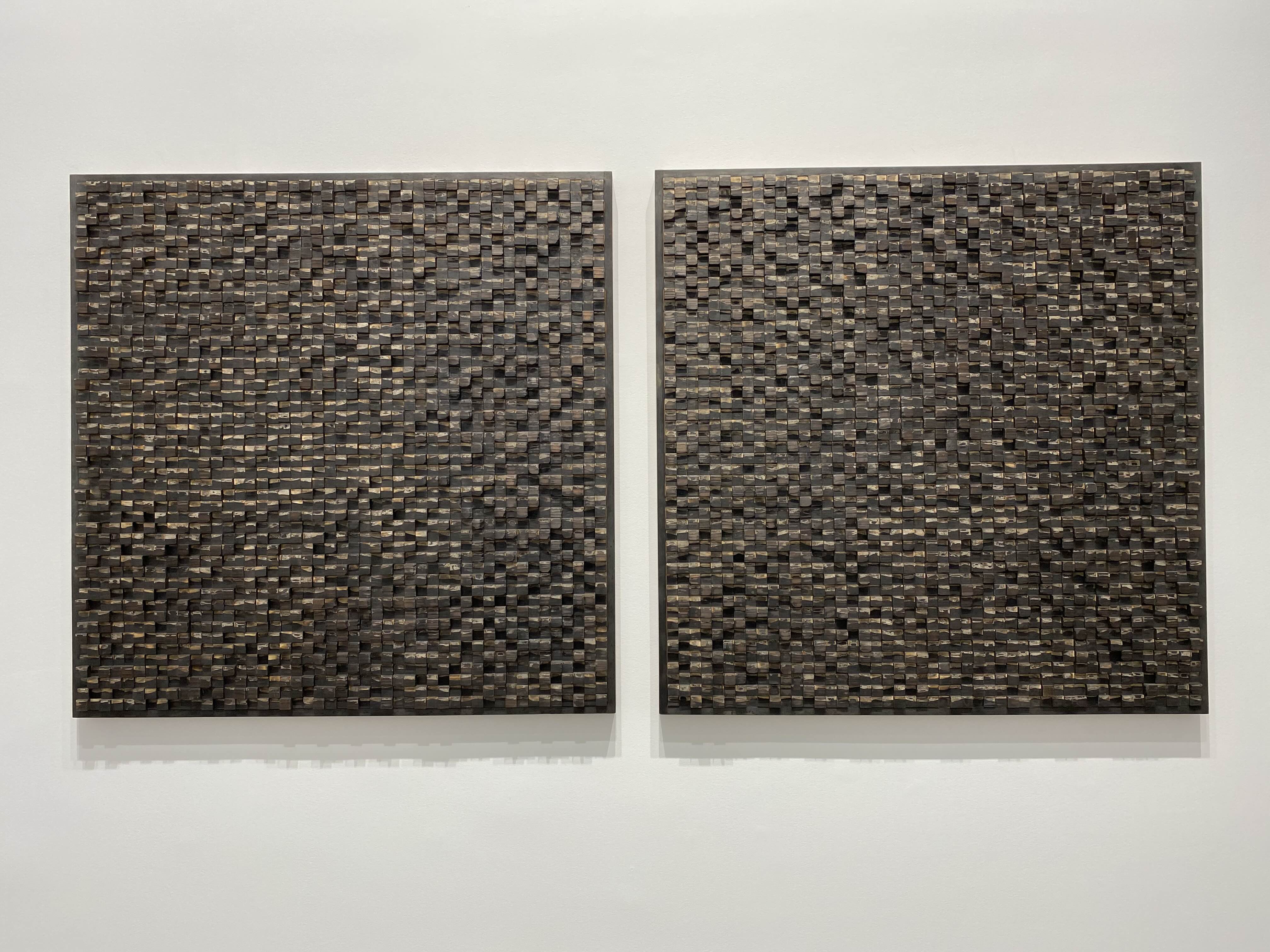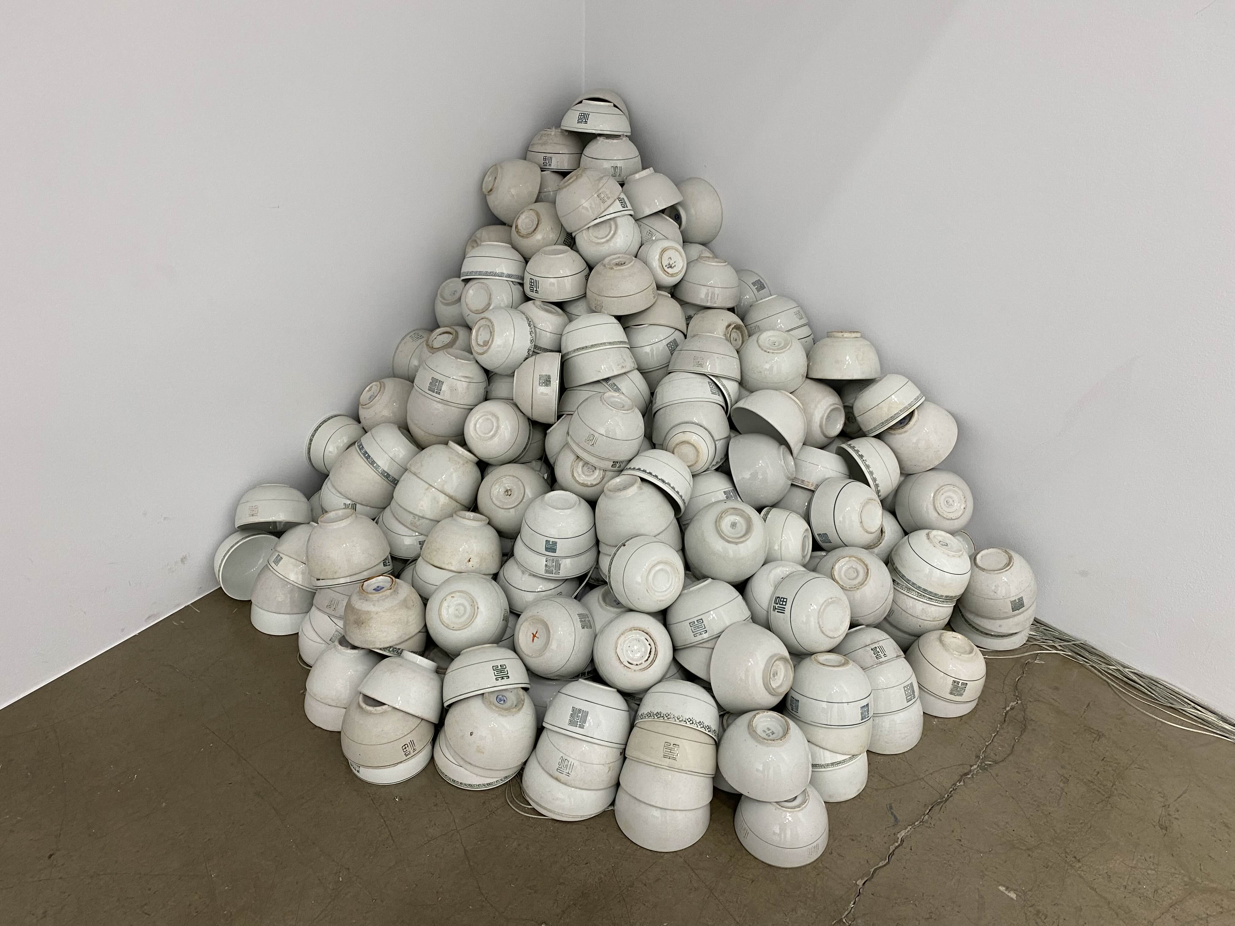 2층 전시장은 ‘산’과 ‘자연’이 테마인 작품을 통해 인간과 자연의 화합을 중요시하는 강익중 작가의 생각을 확인한다. 전시장에 수평으로 나란히 걸린 30여 점의 드로잉 연작 <달이 뜬다>는 전통 산수화를 강익중의 시선에서 재해석한 신작이다. 먹을 사용해 산과 들, 달과 폭포, 달항아리, 사람과 집, 새와 강아지 등을 함께 그려 넣고 그 바탕을 다채로운 색의 오일 파스텔로 칠했다. 경쾌한 색의 조화와 자유로운 획의 흐름이 강조된 드로잉 연작에는 즐거운 태도로 작업에 임하는 강익중의 예술가적 태도와 정서가 담겼다. 48 x 48 cm의 개별 작품이 군집을 이뤄 약 4.5m 높이로 설치된 <산> 연작은 수묵산수화를 보는 듯 장엄한 풍경을 연출한다. <산> 연작은 높이가 다른 작은 나무 조각에 아크릴 물감으로 산의 곡선을 그리고 모아 붙인 뒤 표면을 불로 태우거나 그을려 세월의 흔적을 간직한 듯한 산세를 형상화하는 방식으로 완성된다. 패널의 사이드에 칠해진 색들은 산에서 맞는 사계절의 흐름을 시각화한다. <산> 연작과 함께 놓인 설치 작품 <우리는 한 식구>는 전시장 구석에 낡은 밥그릇 500개를 뒤집어 산처럼 쌓았고, 그 사이로 DMZ 지역에서 녹취한 새 소리가 흘러나와 전시장에 울려 퍼진다. 작가는 마치 밥을 함께 먹듯이 일상에서 기쁨과 슬픔을 나누는 ‘우리’를 ‘식구’라고 칭하며, 남과 북, 가족과 민족의 개념을 환기한다.
