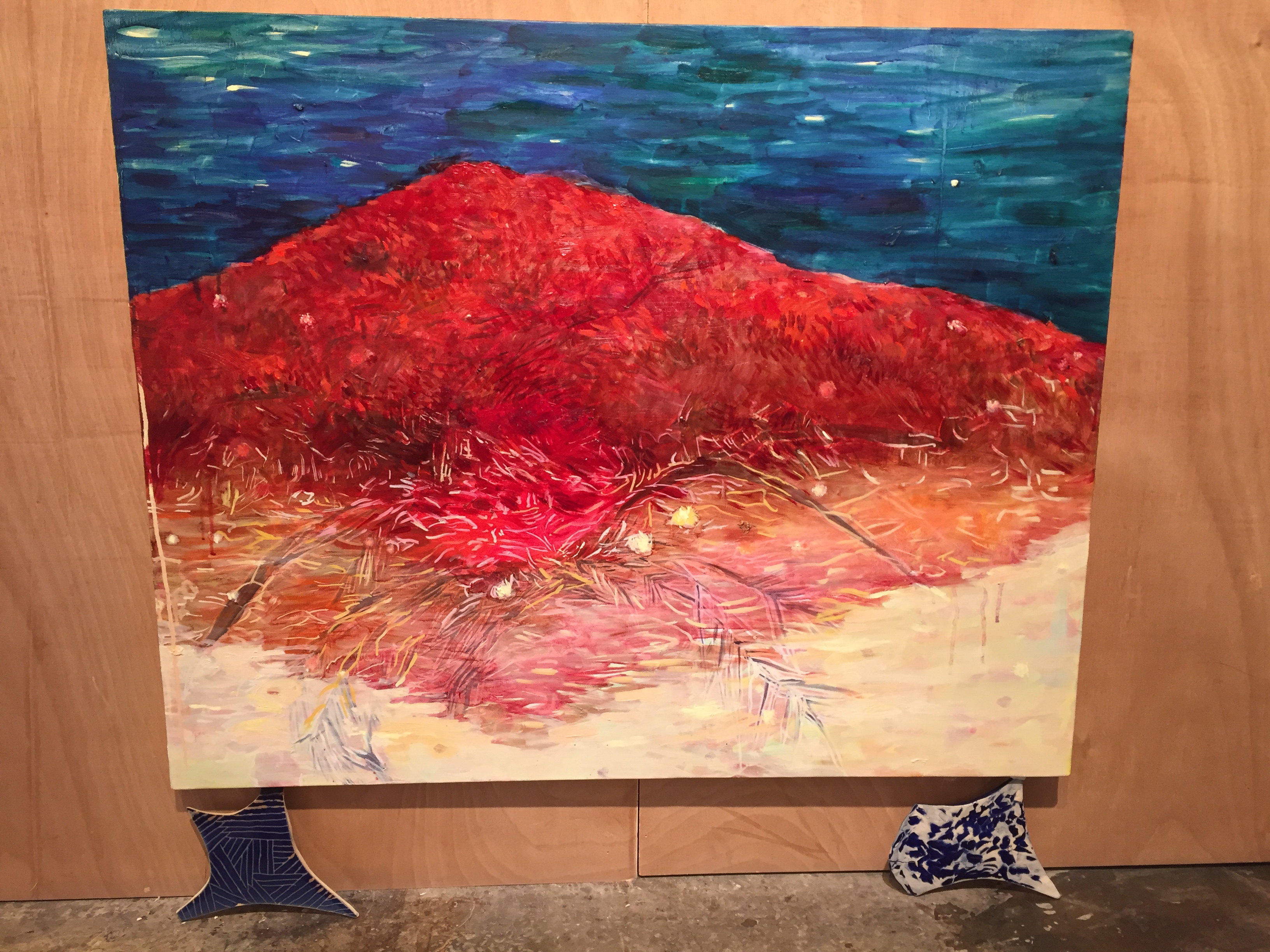 두 개의 별로 화폭을 받히는 그녀의 작품 방식. 느낌과 정서를 시각적으로 옮긴다는 것은 사태와 현상을 고스란히 일치시키는 정면성의 세밀한 재현 방식보다 오히려 회화적이고 서정적인 효과를 갖는다.