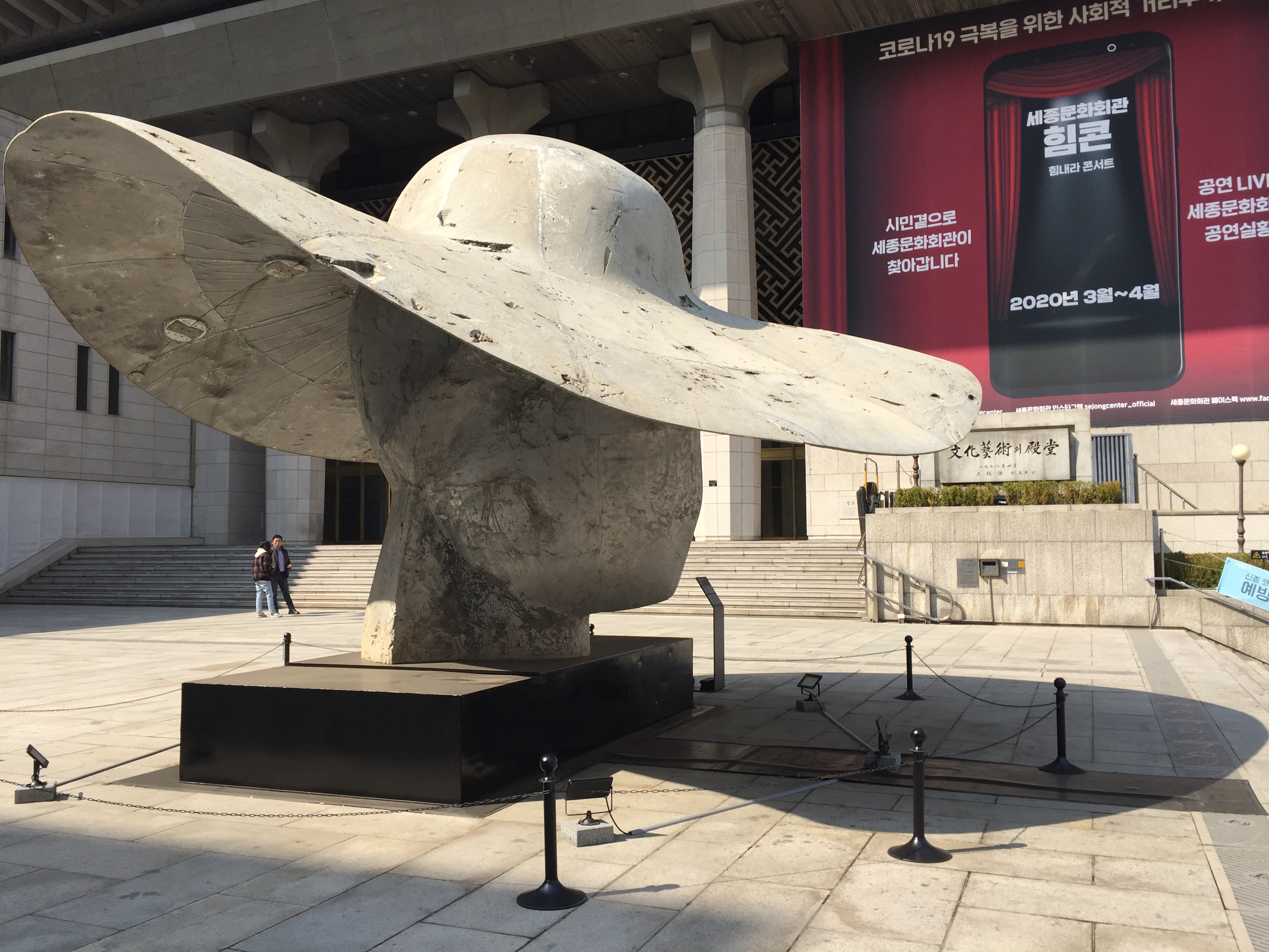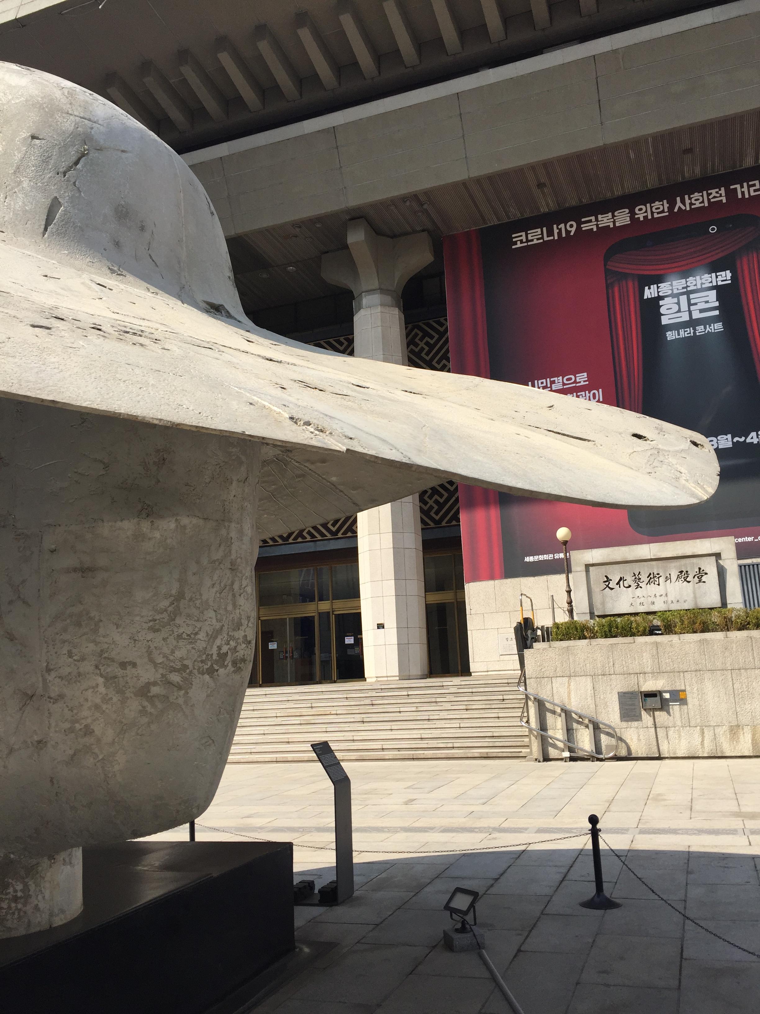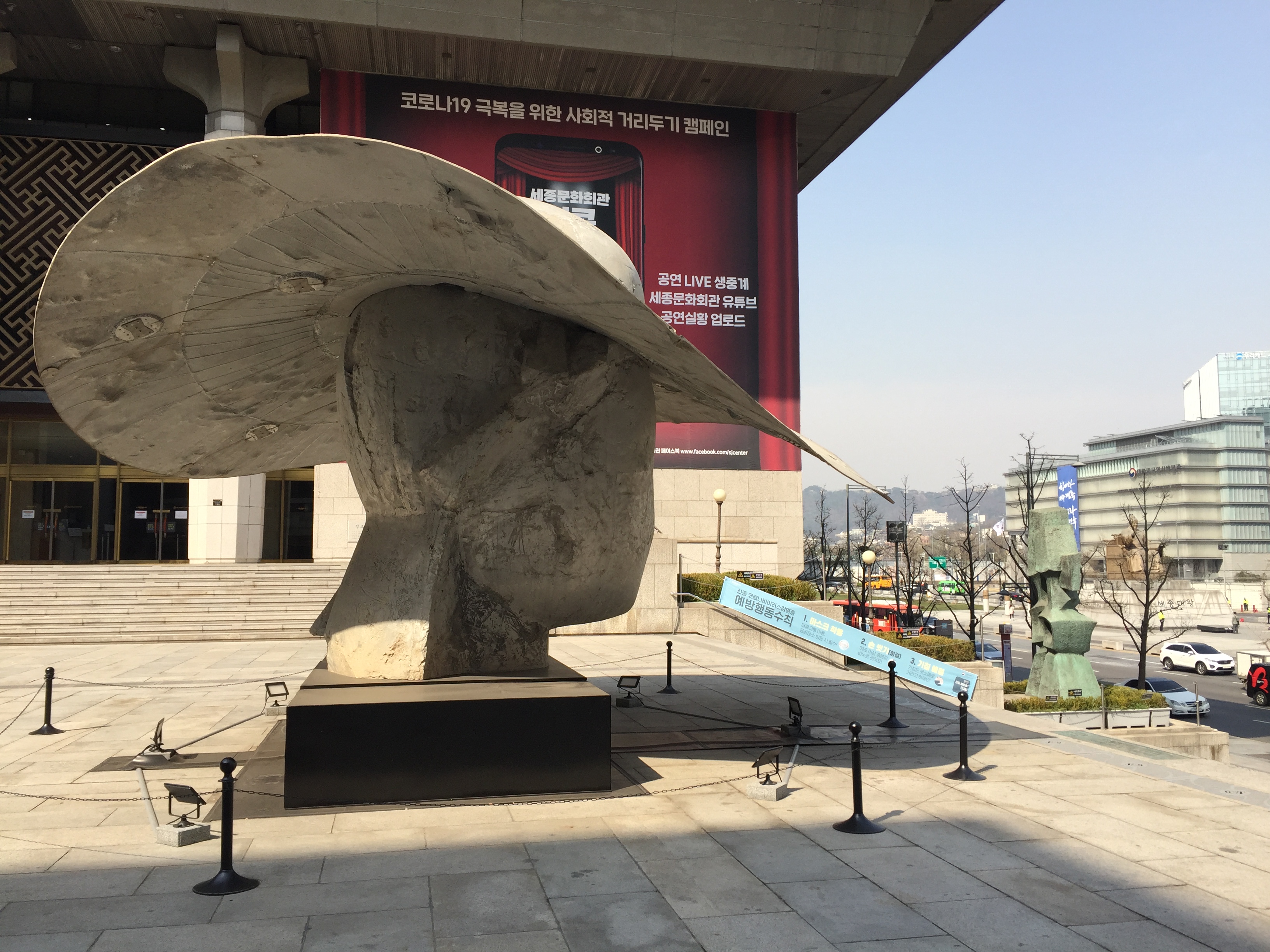 세종문화회관의 중앙계단을 보면 큰 조각상이 보이는데요. 실제로 가까이서 보면 큰 크기에 압도됩니다.