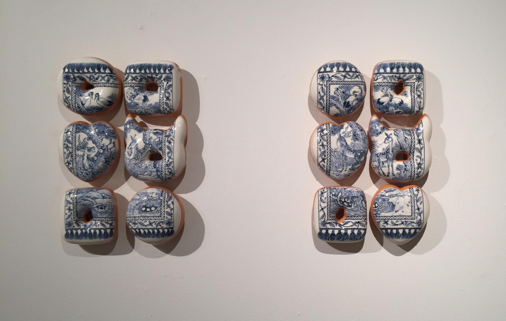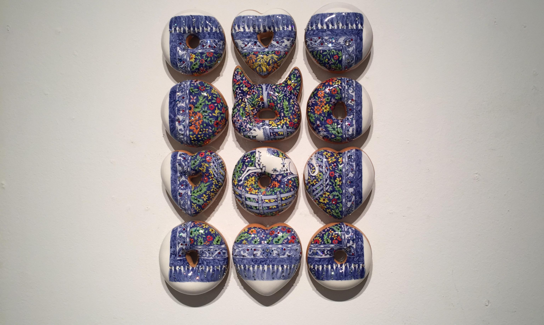 <동양과 서양에서 자랐거든>(2018)은 청하 도자의 형식을 빌려 제작한 작업이다. 91개의 도넛을 둥근 형태로 배치하고 청화 안료로 그림을 그렸다. 본바탕은 청화를 떠올리게 하지만 중동풍 아라베스크 문양이 눈에 띈다. '카펫'을 검색했을 때 나오는 이미지를 모아 재구성했다.